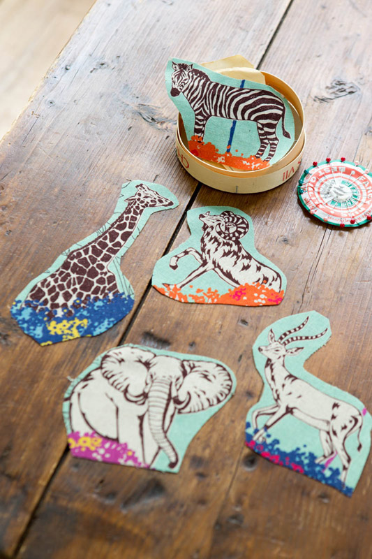 This is a scene of animals gathering, while curiously coming and going, around acacia in echino color. It seems as if the animals are magnetized by the brilliant colors of trees. You would love to make fabric panels or small animal-shaped pillow, after cutting out your favorite scenes or animal motifs.