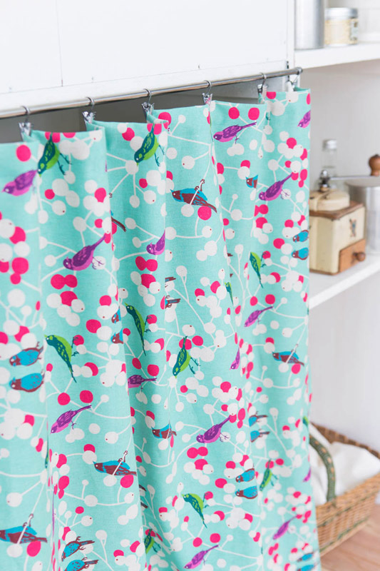 Colorful birds with “echino color” frolic in and around the cherry tree. The multiple variations of colors create different scenes even with the simple motifs of fruits and birds. Isn’t it fun to makeover curtains depending on the seasons, with green-based fabric for spring and blue for summer? If you want more chic and feminine bags or pouches, the black fabric with vivid pink cherries is attractive!