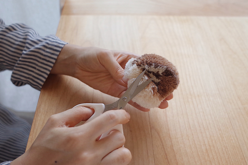 It is so exciting to see what shows up by snipping off the fully-wrapped yarn with scissors to create a pom-pom. Then, the excess yarn is trimmed off to shape it like sculpting a statue.