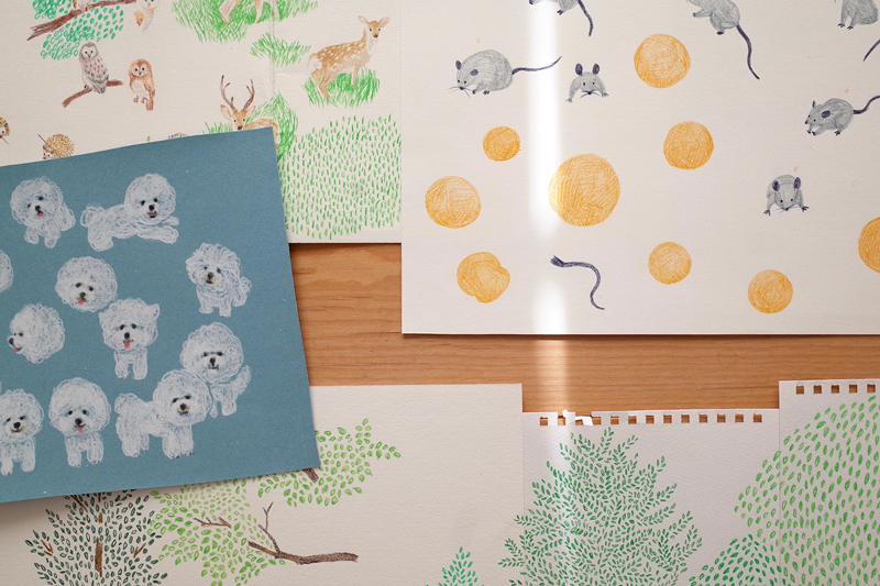 When working for the first series, I scanned every single hand-drawn pattern with my portable A4-sized scanner, and then collaged them. As for [Bichons], I tried not to place the same dog together so that the fabric could be more enjoyable when the fabric was spread.