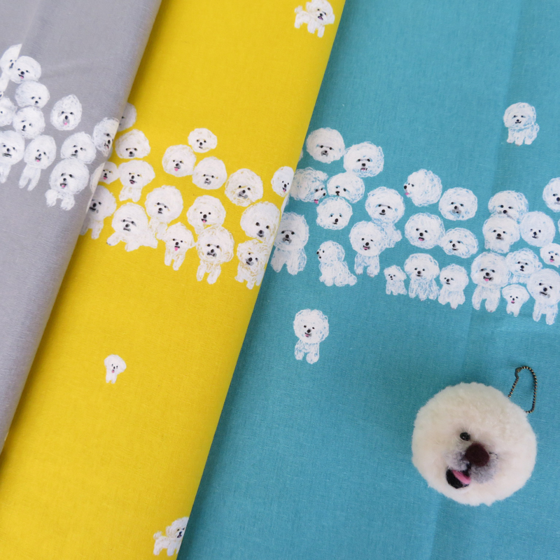 The first series featured four designs. I designed [Pompom Animals] with carnivore and omnivore. I made [Cheese Holes] that resembles cheese all over the fabric, where mice scampering across. In [Mori], I depicted animals appearing here and there in the forest. The most popular print in the first series, [Bichons], is filled with Bichon Frises that cover the fabric entirely.