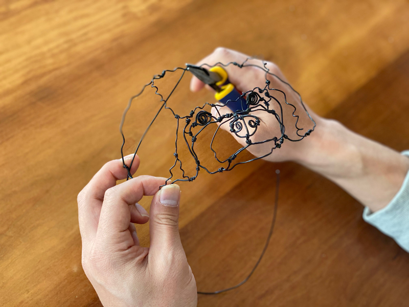 There are many ways wire can be shaped. In my case, I make it without a rough sketch. When I make an animal wire sculpture, I start by making its eye balls. The size of eyes determines the whole size of sculpture.
