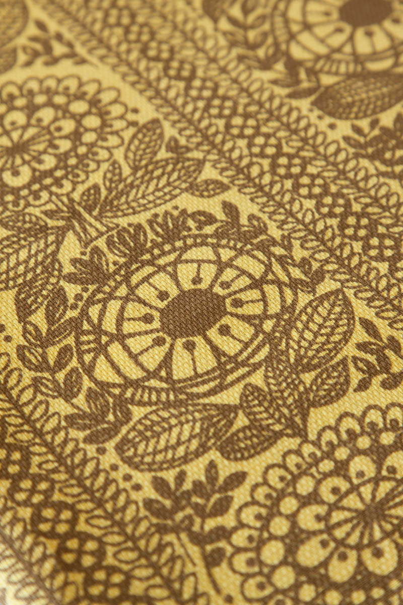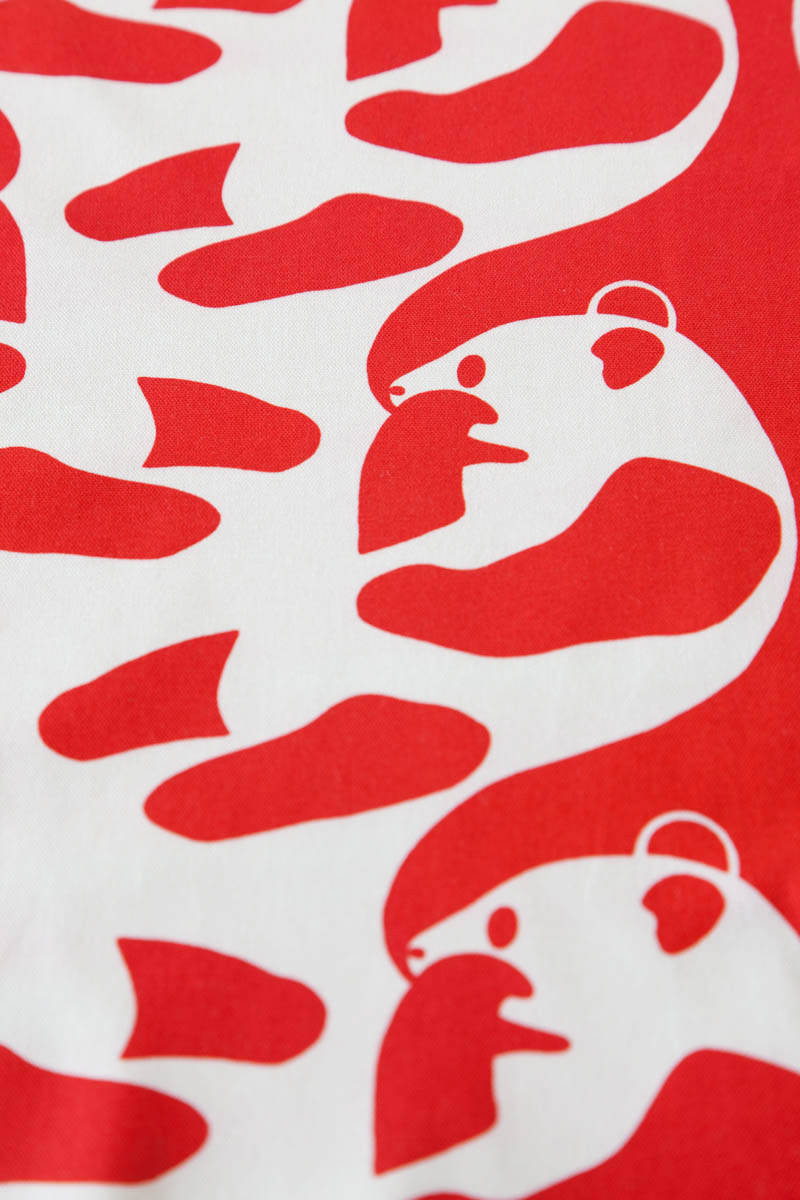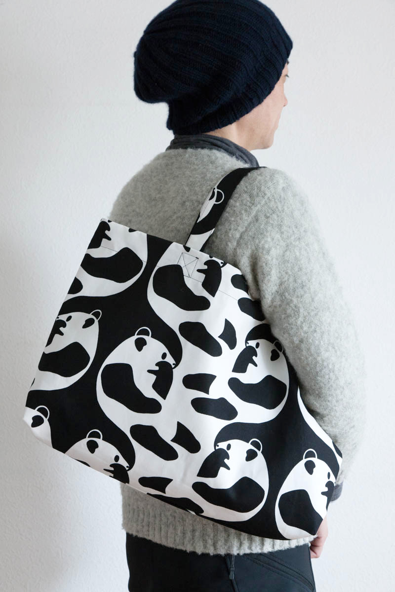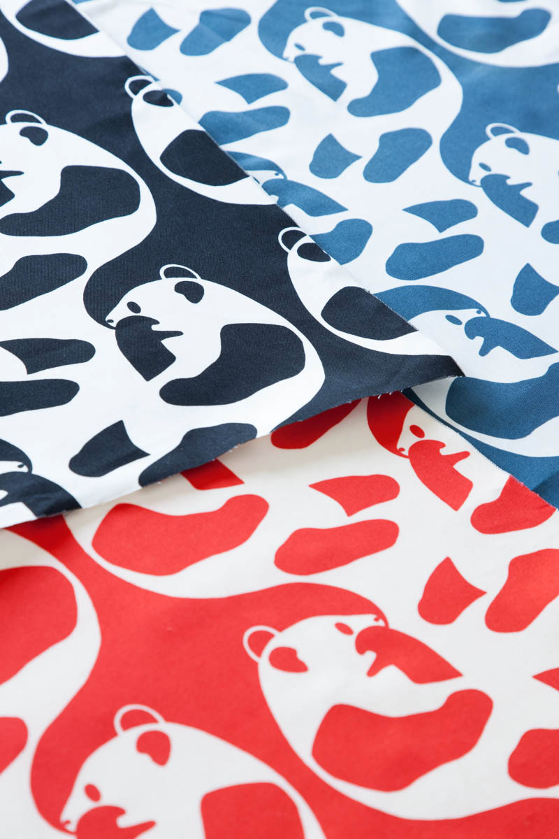 The name “Ajatus” means “a thought or an idea.” The design presents lined-up pandas in a pensive mood. With a 160cm width, it is mainly suitable for interior décor items, but it can also be turned stylishly into clothing like a dress and a shirt or a bag.