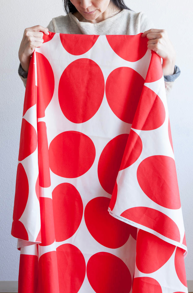 The design is so rhythmic and lively, it is as if it were going to pop. A curtain made from this fabric with large oval motifs will be very striking. It can also look cute as a dress.