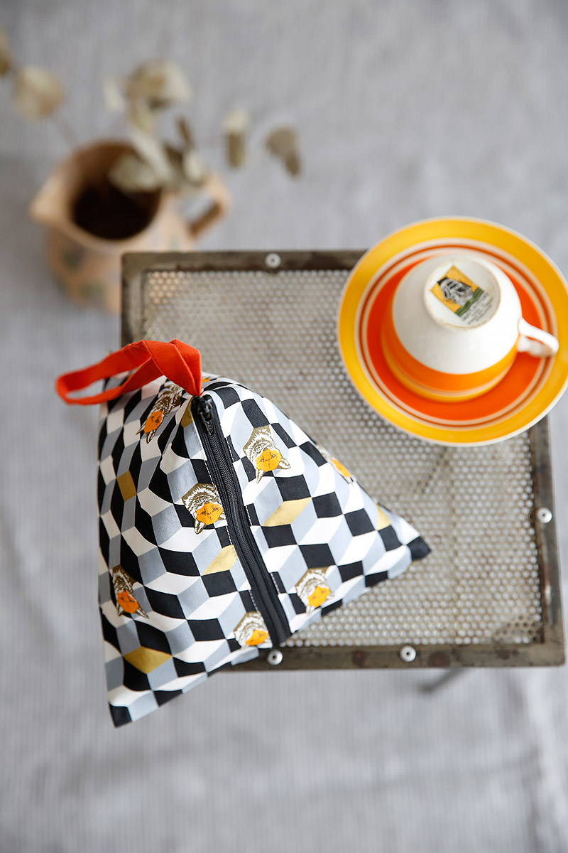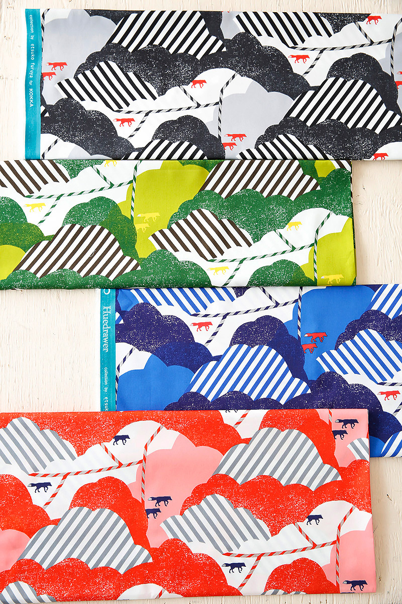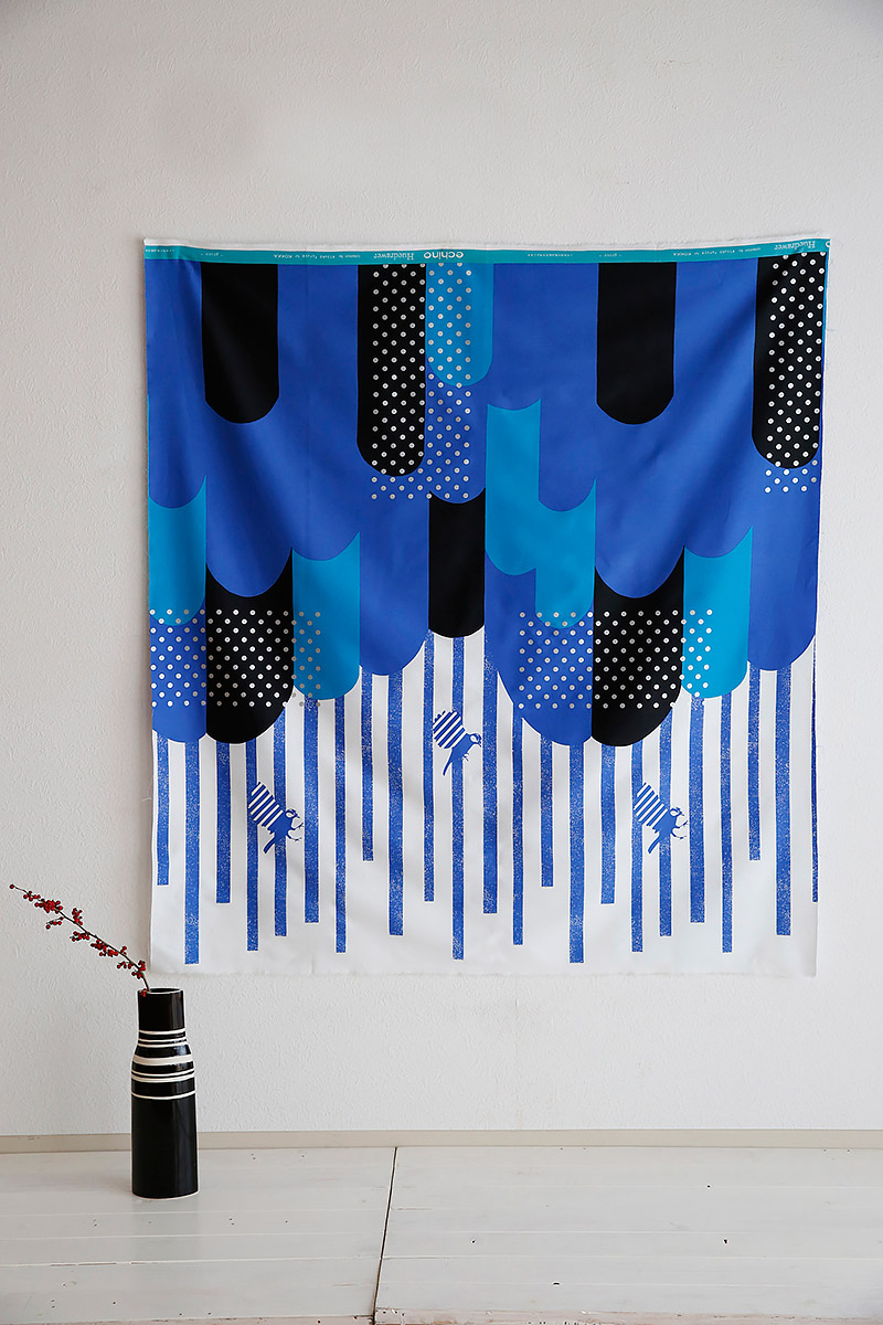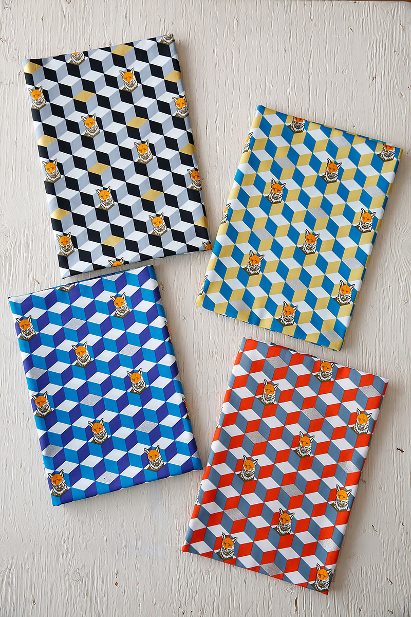 The design features foxes peeking out of burrows that are drawn in a “box” form. Though the design is simple, silver and gold sides of the box work as an accent, making this fabric look both cute and unique. Since the motifs are little, small items as well as bags and shirts will look great in this fabric. Black and blue color series can be perfectly utilized for items with unisex feel.