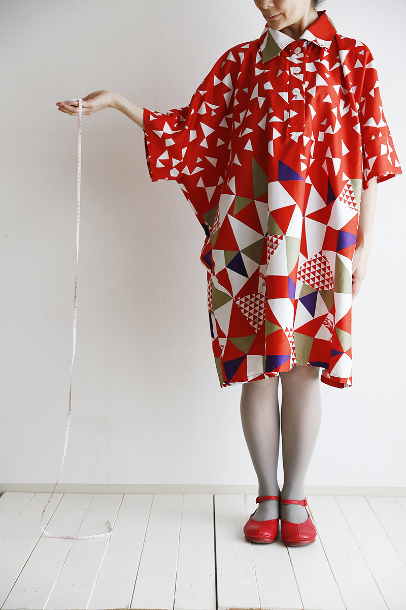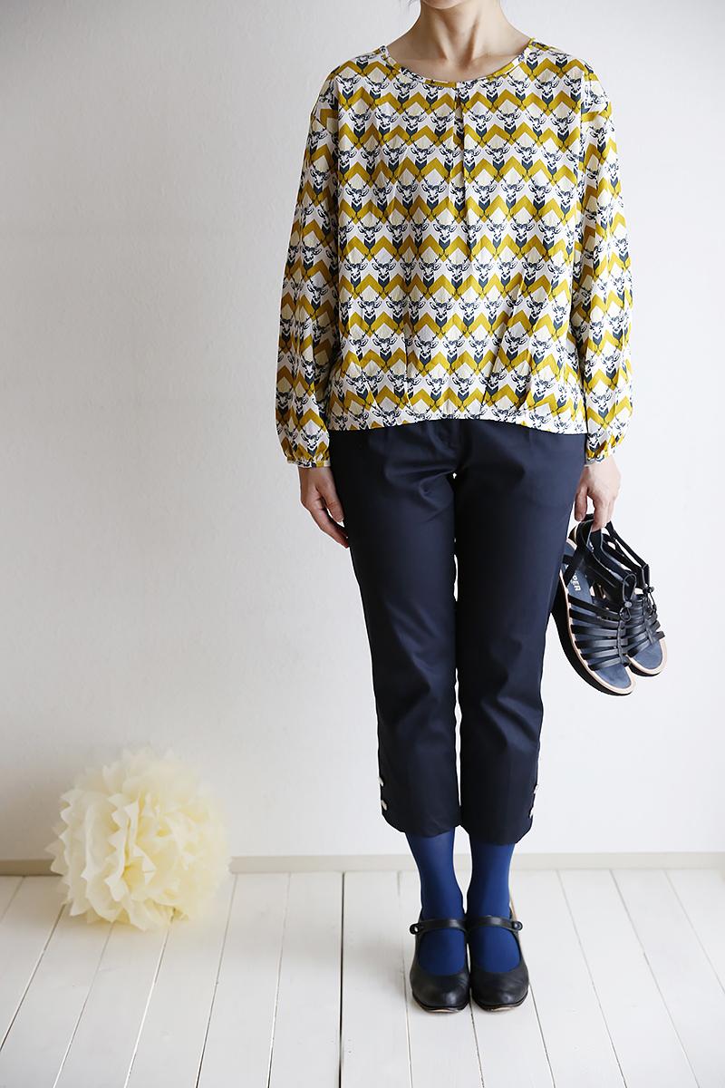 “With a range of mountains in the distance in mind, a graphic representation of mountains are described on this fabric. Using the design that spread over the edge of this 110cm-wide fabric, it will be interesting to sew a dress or a masculine shirt. I also recommend this fabric for an interior décor item, like a fabric panel.” (by Furuya)