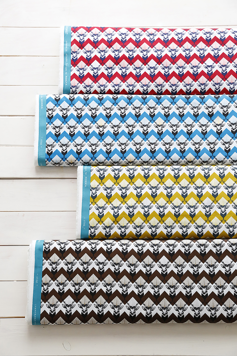 “stag’s design consists of a very echino-like combination of male deer and zigzag pattern. A distinctive stag motif is the accent of this textile. With small patterns, it is a versatile fabric for making anything from small items to clothing. Depending on the combination of the colors, the design could create a unisex image.” (by Furuya)