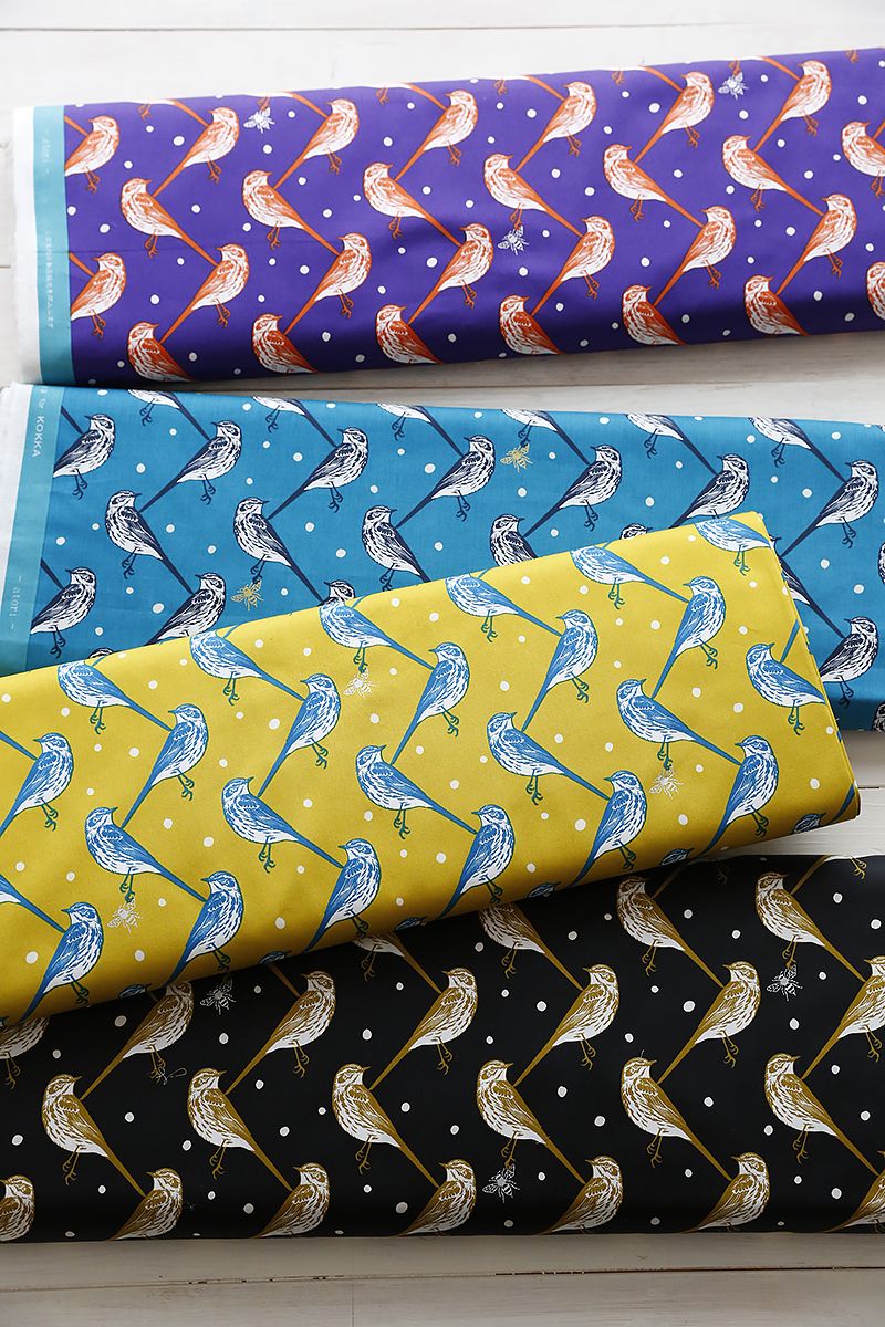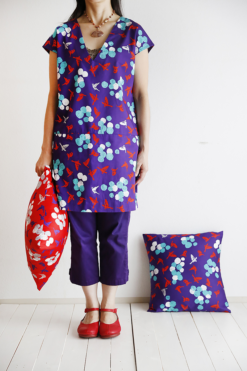 “The birds that are spreading their wings and flying away – this is the design image behind soaring. As varying color combination creates different images, a grown-up-like dress, tunic and skirt would look great in this fabric. In this design, a subtly sparkling bird is also flying among a sea of birds.” (by Furuya)