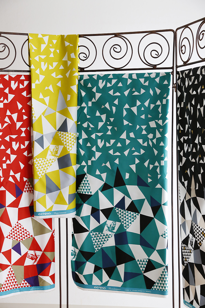 “Making you want to go out and feel the nature wrapped in a nice and silky fabric – that was the image I had when I designed this fabric. Different expressions created by various combinations of colors, and the process of selecting bright colors from the “Huedrawer = the drawer of hues” are the elements incorporated in this design. With these elements, Huedrawer is the kind of textile that makes you want to pleasantly contemplate which one to use for your project.” (by Furuya)