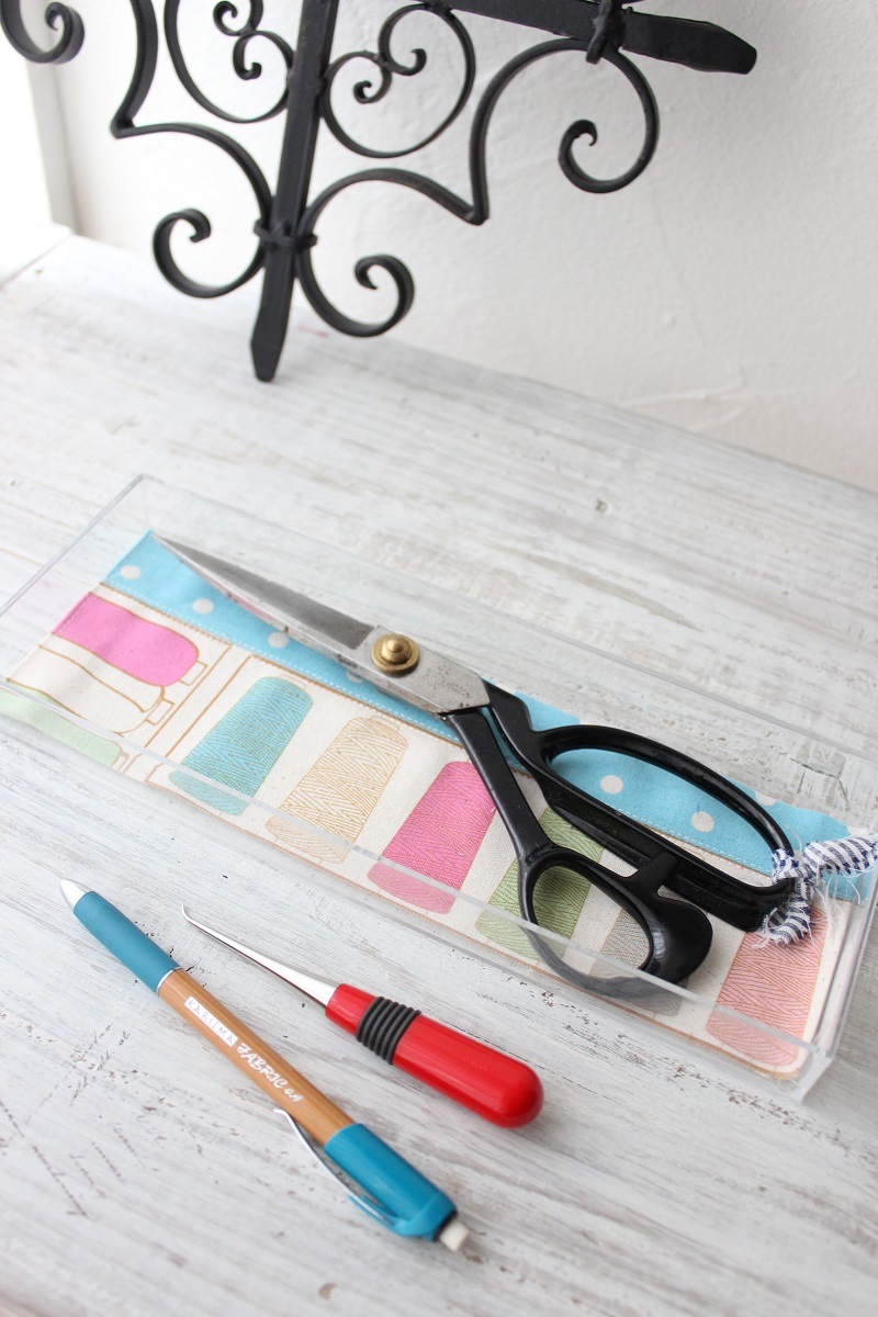 You can get a clear tray at reasonable price for 100 yen apiece. With the remnant, the simple container could be transformed into a colorful and delightful drawer organizer. “This tray must be for sewing materials and tools.” Everyone can say so by looking at the tiketiketic print which is depicting sewing items. That is great idea!