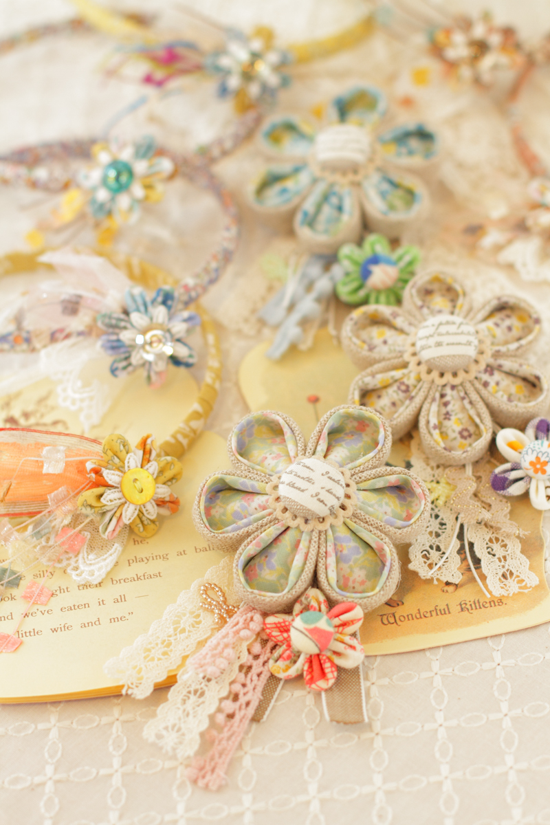 The brooches and headbands were made by titocetera who sells handmade items online. She says, “Fabric flower is one of my most favorite items to create. It’s so fun! I make petals one by one from cottons or linens, which have a great variety of colors and patterns. I like using cotton fabric with small floral pattern to make its loveliness visible even in tiny petals. Many of the small floral cotton prints have thin and soft texture. Therefore, for making a big fabric flower brooch, I use a combination of cotton and linen with crispy texture to make a double-layered petal. In doing so, I can prevent deformation.”
