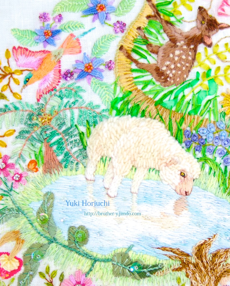 The embroidery artist Yuki Horiuchi created the work in the above picture. Can you believe everything in the picture is needlework? The flowers and animals depicted in detail by using colorful threads and various embroidery techniques are just incredible! While sheep’s crimpled hair looks startlingly real, Bambi the white-tailed deer with beautiful fur is depicted adorably. The reflection on the pond of the sheep drinking water was embroidered as well. This tranquil landscape with animals has a whimsical atmosphere. It may be the image of animal sanctuary that came across Horiuchi’s mind.