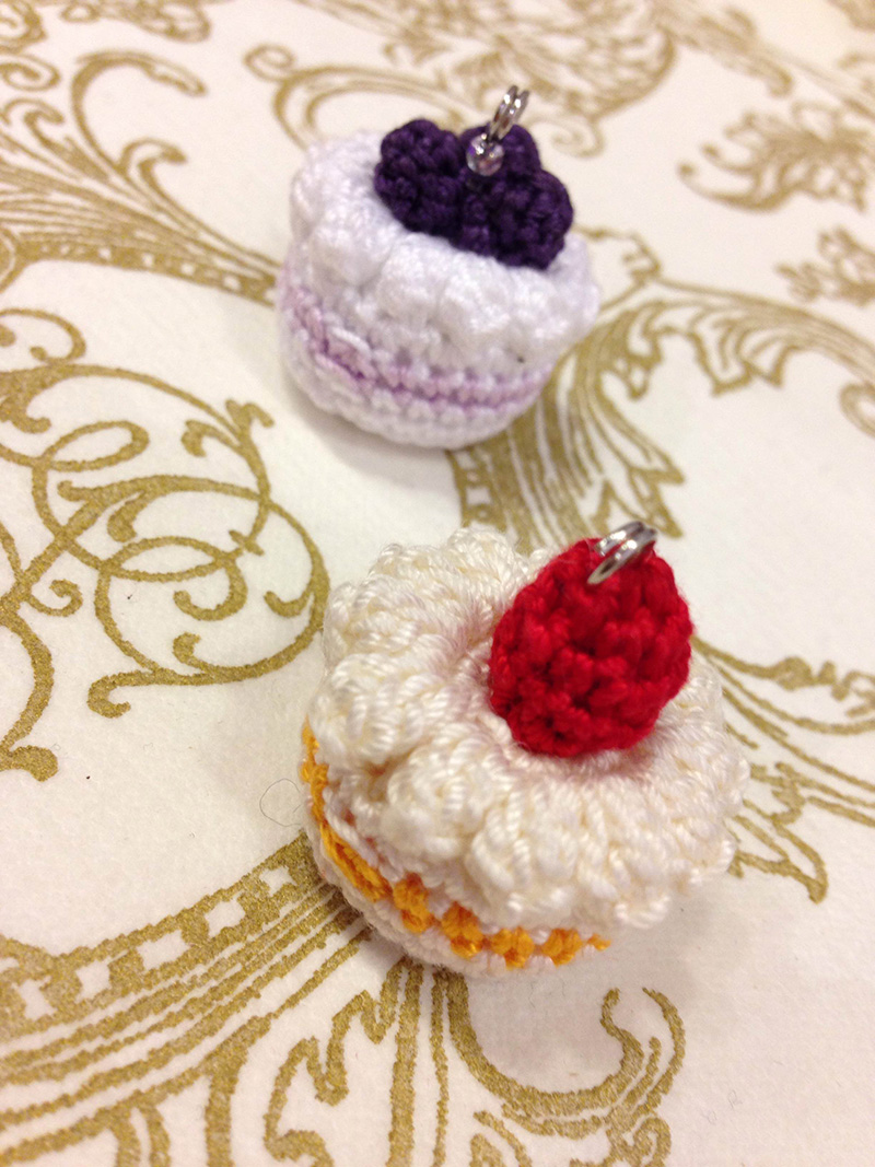 The base of each blueberry and strawberry cake was crocheted in the same way by #0 lace hook*) with #20 lace thread. Attaching a metal part, it can be used in many ways such as a cell phone strap, key chain or purse charm. It can also be a pendant with a long chain. Some people use it as an earphone jack/dust plug for their smartphones.