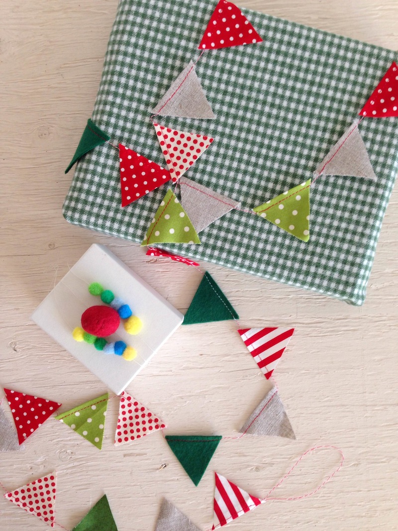 In the picture is a mini pennant garland which was made with a bunch of leftover fabric scraps coordinated with conventional colors of Christmas – red and green. The garland of small triangle pennants, 3 centimeters on a side each, can be a ribbon to embellish the wrapped gift. The garland turns out decoratively by combining distinct textured pennants from cotton prints, linen, and felt. You don’t have to trim the row edge of each piece. But your garland can be lovelier if you cut it out using your pinking shears. Fold and press the base side at 7 millimeter, match up one pennant with another pennant, and then sew sides together with a sewing machine. If you want to make a cord between each pennant, just continue running the machine without sewing fabric. Upper and bobbin threads tangle each other, and it can be like a cord. You can also make a pretty two-toned cord by using different colored thread for each upper and bobbin.