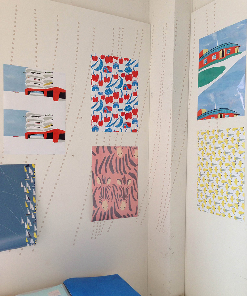 While one of her entries “apple” is a very textile-like design with the repeated drawn motifs, others depicting airport or lighthouse are just like paintings. The composition for each work is unique, and they would also be good as pictures on the wall.