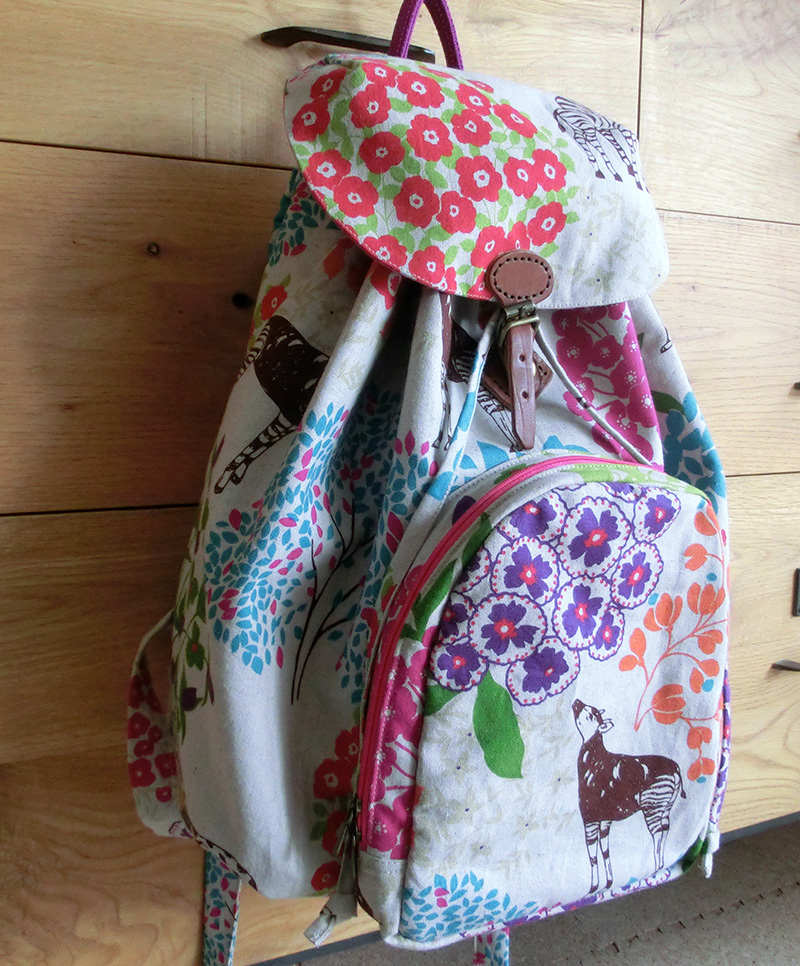She continues, “A front pocket was one of my friend’s demands for the bag. I thought that a design with animal looking up would be perfect for the front pocket. That is the reason I used this fabric. I shaped the pocket to make the okapi appear more effectively. I could place the pattern of leopard on the back, too.”