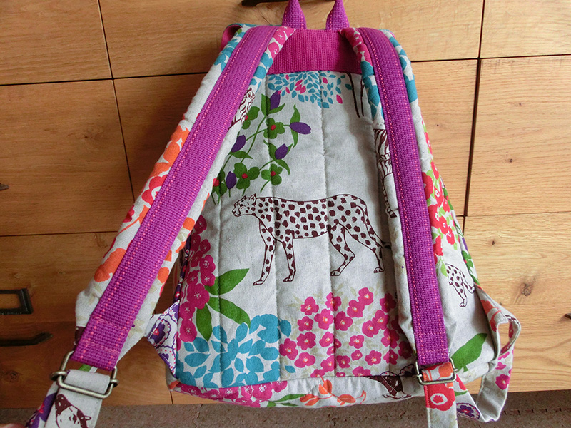 What gives the backpack snap is the pink zipper. But she expresses discontent, “I can hardly find brightly-colored zippers in regular fabric stores. I wish I could buy colorful zippers at directly-managed shops of Kokka.” Quite so. It must not be easy at all to find suitable supplies for echino fabric with bright and saturated contemporary colors. Wouldn’t it be nice if more handicraft supplies including zippers and buttons could be available at Kokka?