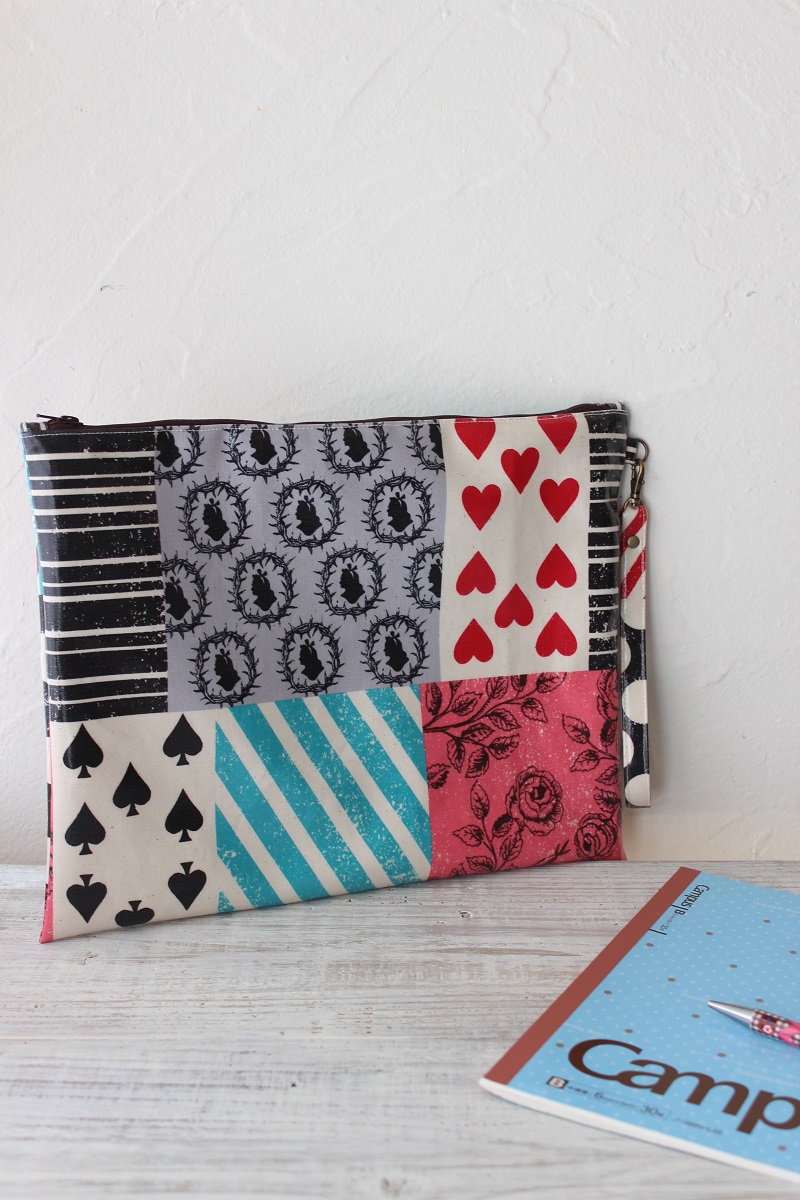Besides the double-sided clutch bag, Inomata made another bag in B5*) size with “Trump” print from the collection. In the above picture is the one. Look closely and you will find it is shiny! Inomata picked the one from laminate-processed “Alice in Wonderland” fabric collection. Laminate fabric is regular woven cotton on the wrong side and is coated with a plastic finish on the right side.