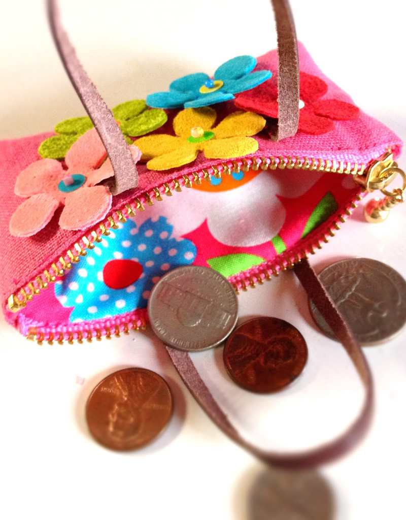 Above is a bag made from pink linen decorated with suede flowers. It’s an extremely lovely figure! A pop-arty flower print can also be found the inner lining of the bag.