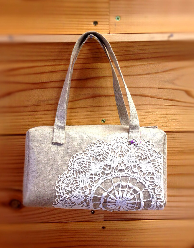 The bag shown in the photo above is made from mangle cloth; German antique linen creates a gentle atmosphere by adding an old doily. The shape of this bag is the same as the mini purse with a drawstring bag we introduce in the craft and sewing column.
