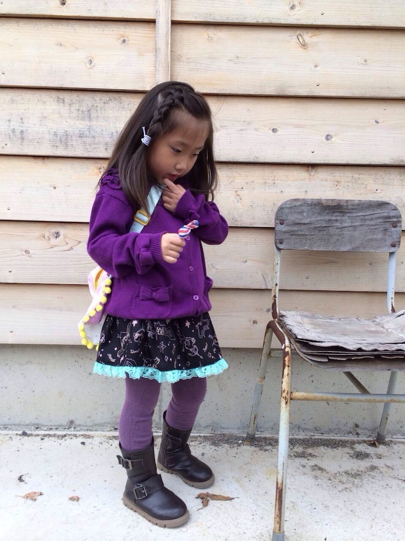 The girl wearing the skirt in the above picture is Saito’s oldest daughter. The skirt and the candy-shaped purse from same fabrics in a different coloration are perfectly matched. For her daughter, Saito coordinated the solid purple tops to bring out the printed skirt. With the same colored tights and black boots, the girl became very stylish. Saito will soon post the sewing tutorial for the skirt in her blog. I can’t wait to know how to make it.