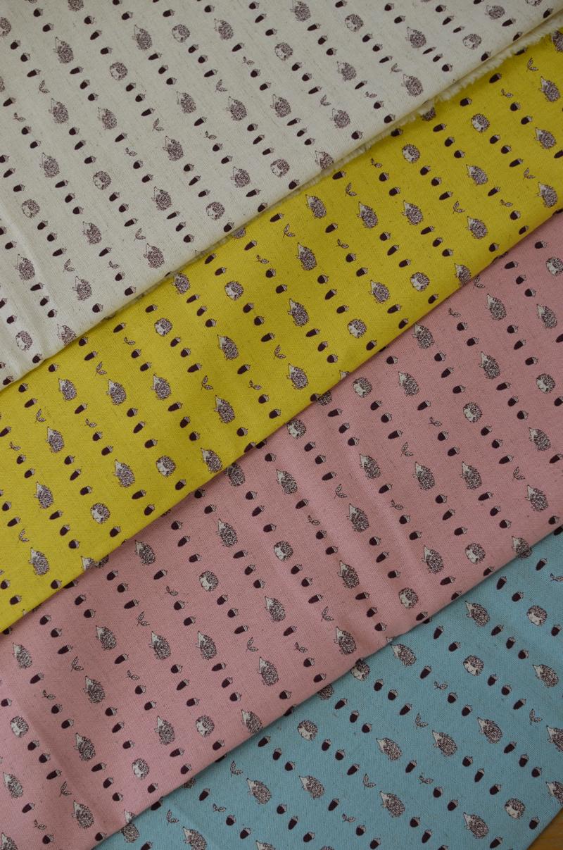 This hedgehog print is available in natural, mustard yellow, and also comes in pink and blue.