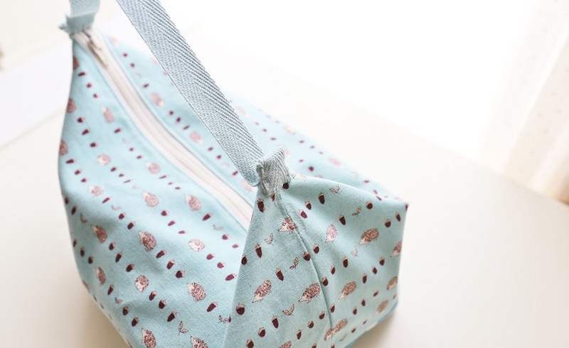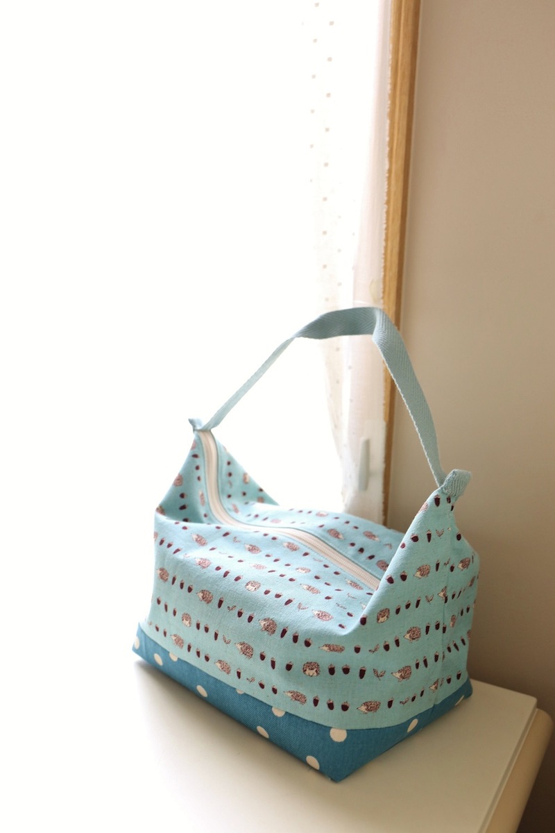 Few month ago We introduced a lunch bag by Mioko Sugino at the craft & sewing page. Soon after that, I found the same pouch in a different color on her blog. It could be thought of as ‘a bag’ rather than ‘a pouch’ due to its size. The lunch bag at the craft & sewing page was pink but this pouch is a balmy blue. I was eager to introduce this pouch in this column, so I asked Sugino to send me some photos.