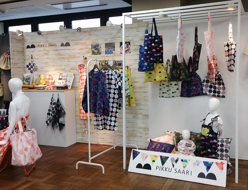 Let’s start with “Pikku Saari”, the colorful and eye-catching textile from Finland, created by Eri Shimatsuka who is the Helsinki-residing designer. The motifs inspired by her daily life in the seaside city Helsinki are spread across the fabric.
