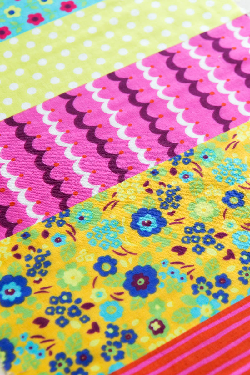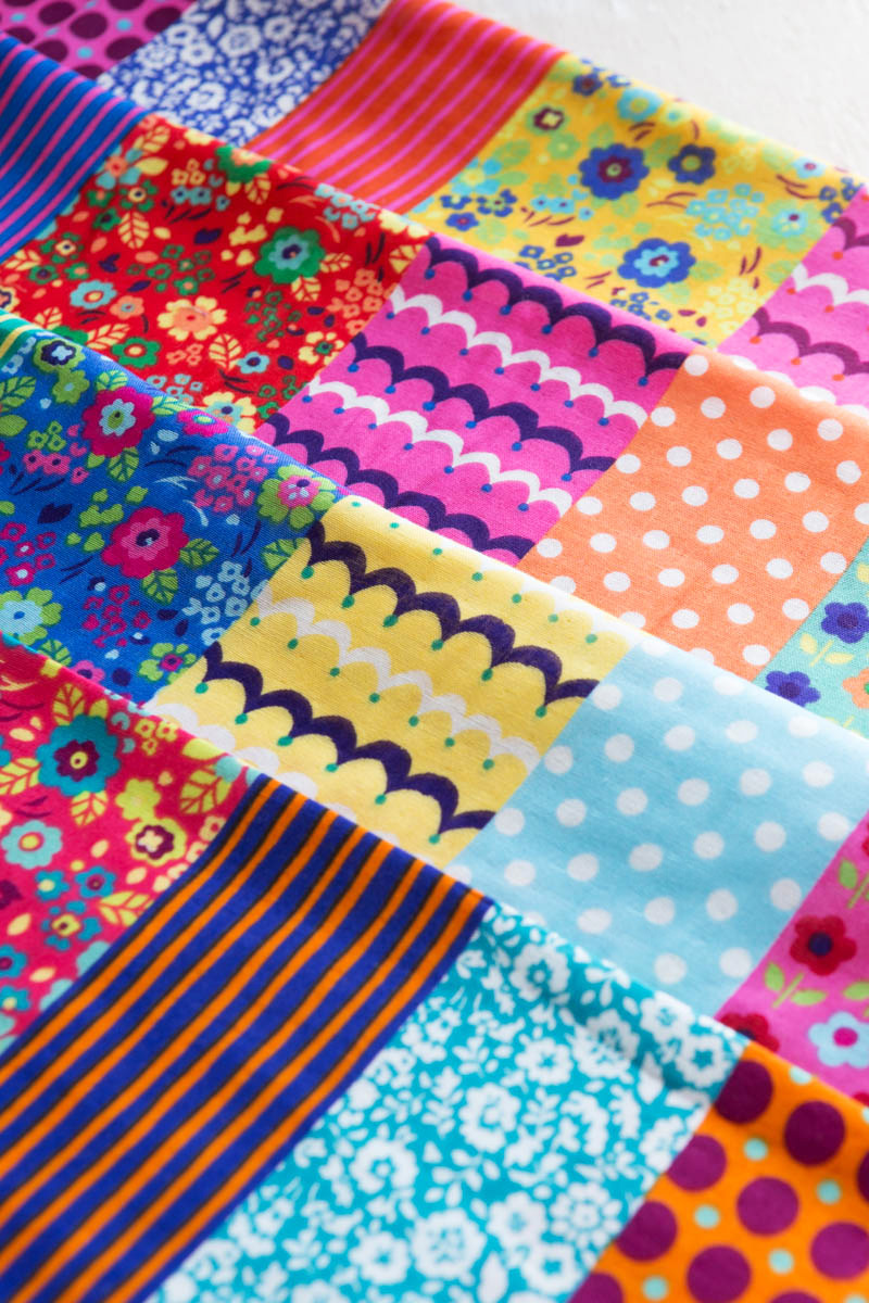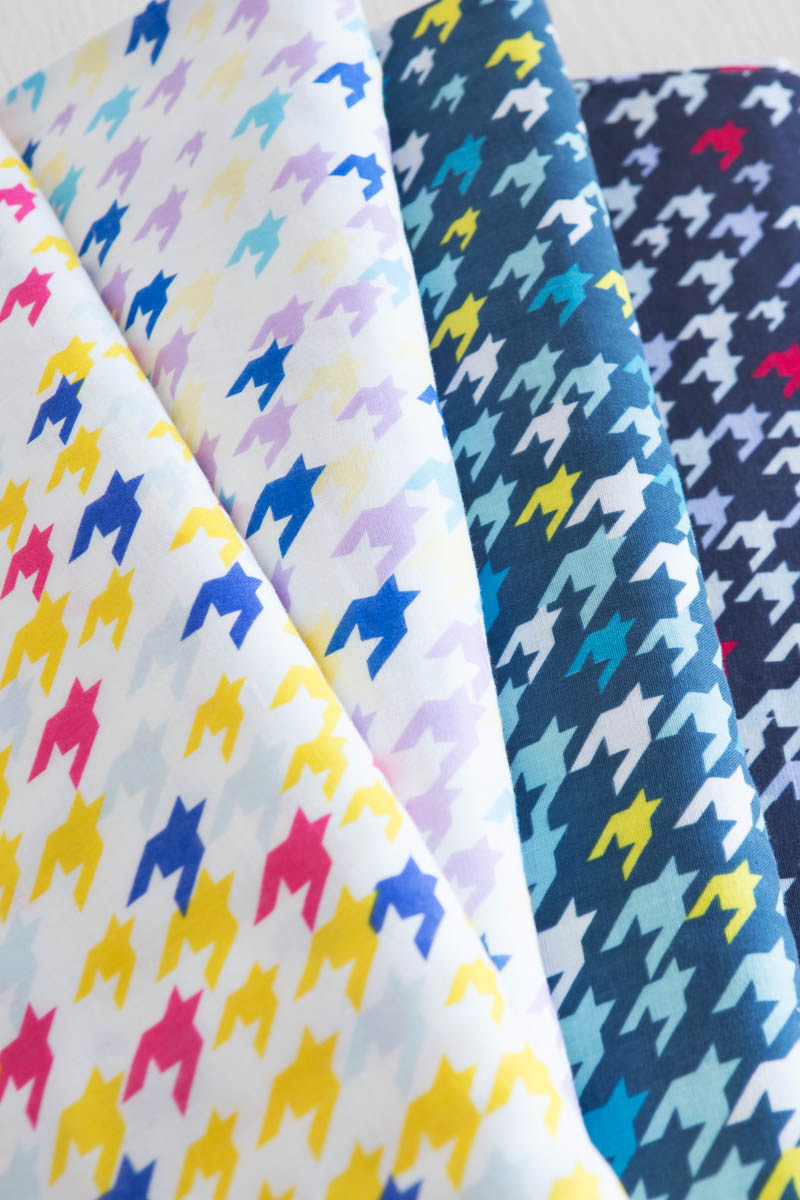 Various designs including flowers and polka dots are combined to create a striped design. Just like the random hound’s tooth, this fabric is made of double gauze in colorful and pop tones. It is perfect for baby and kid’s clothing as well as for a skirt for grownups. It creates a strikingly beautiful look.