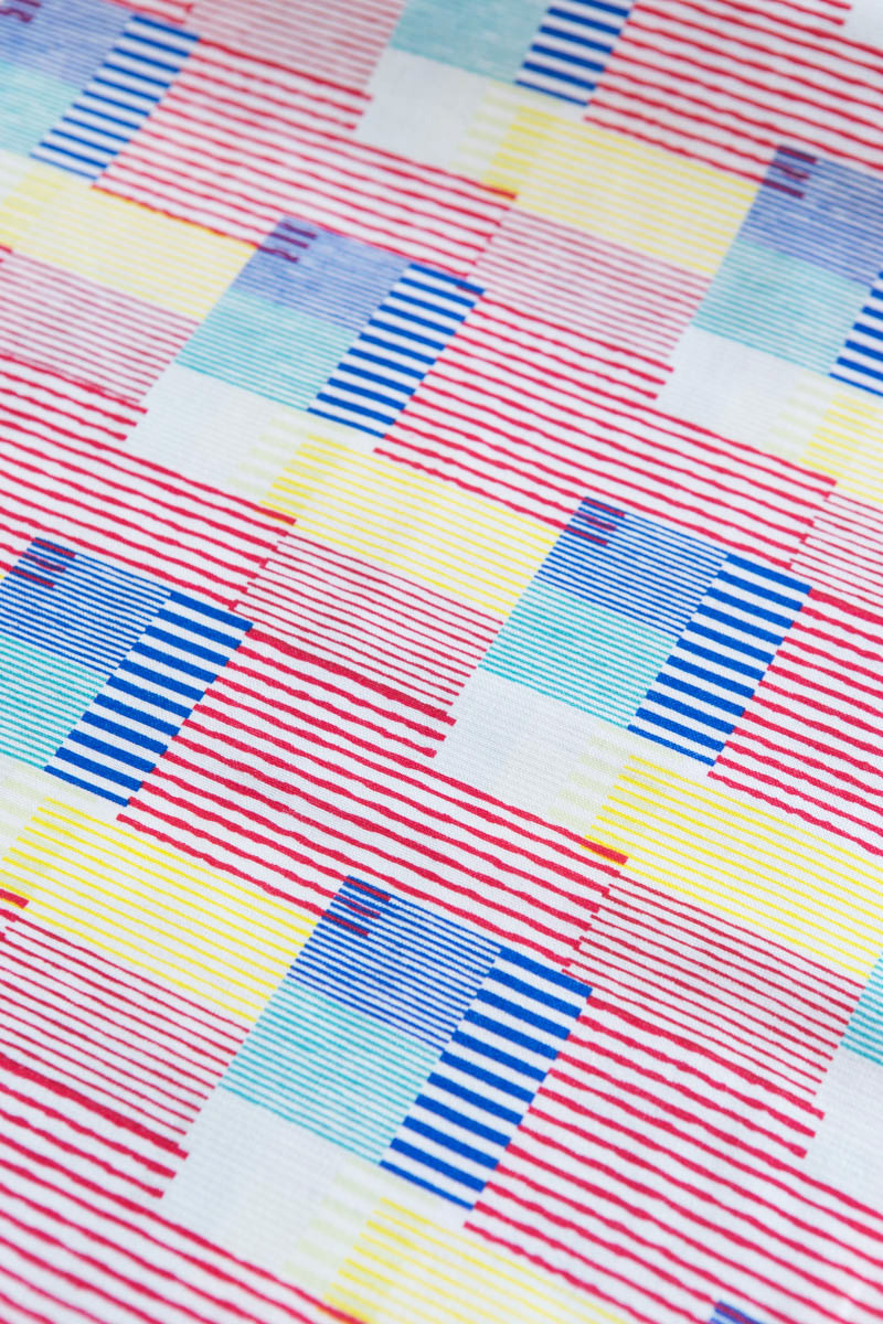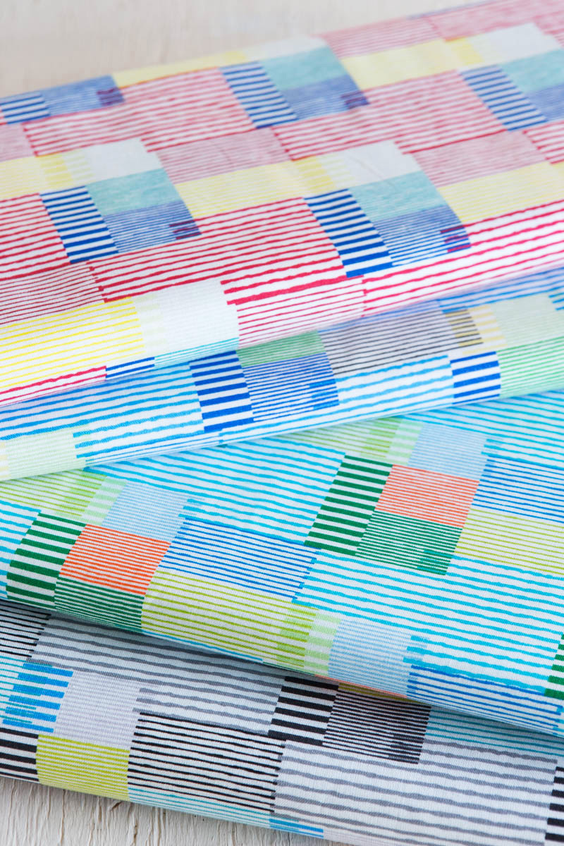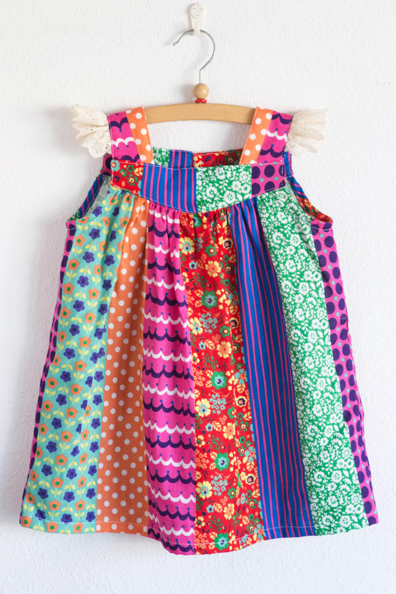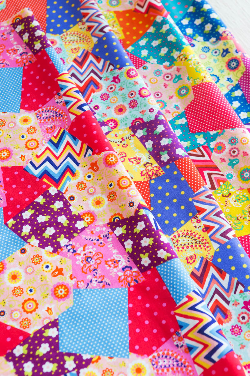 Various designs including flowers and polka dots are combined to create a striped design. Just like the random hound’s tooth, this fabric is made of double gauze in colorful and pop tones. It is perfect for baby and kid’s clothing as well as for a skirt for grownups. It creates a strikingly beautiful look.