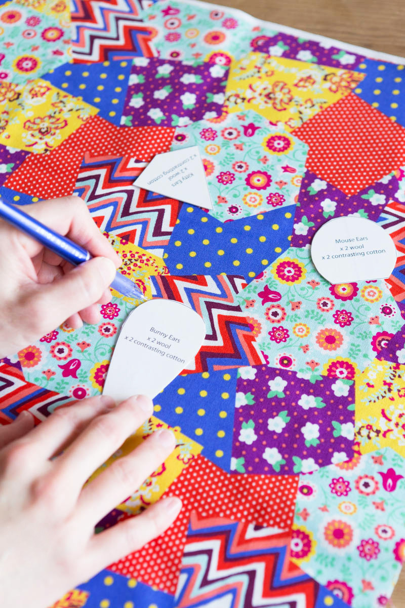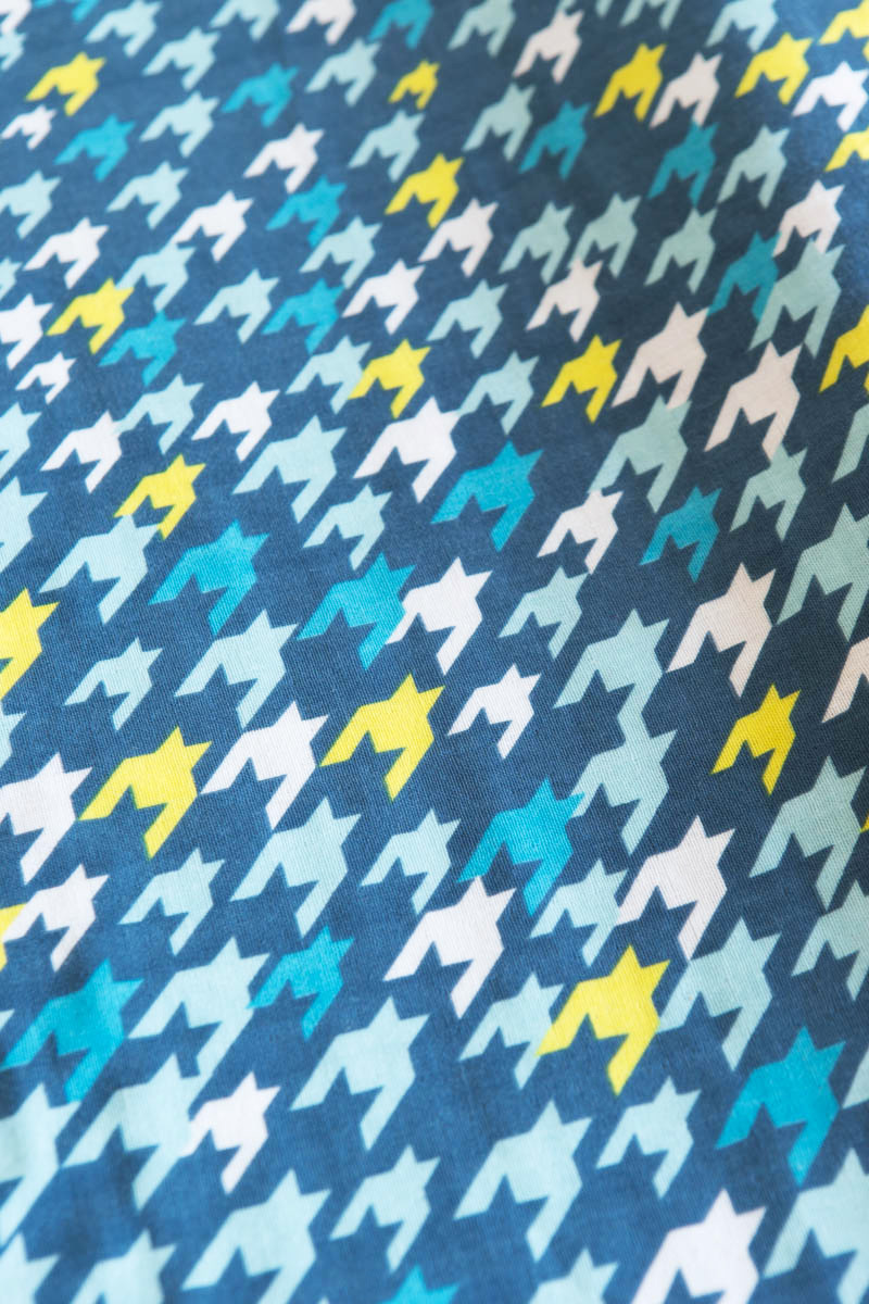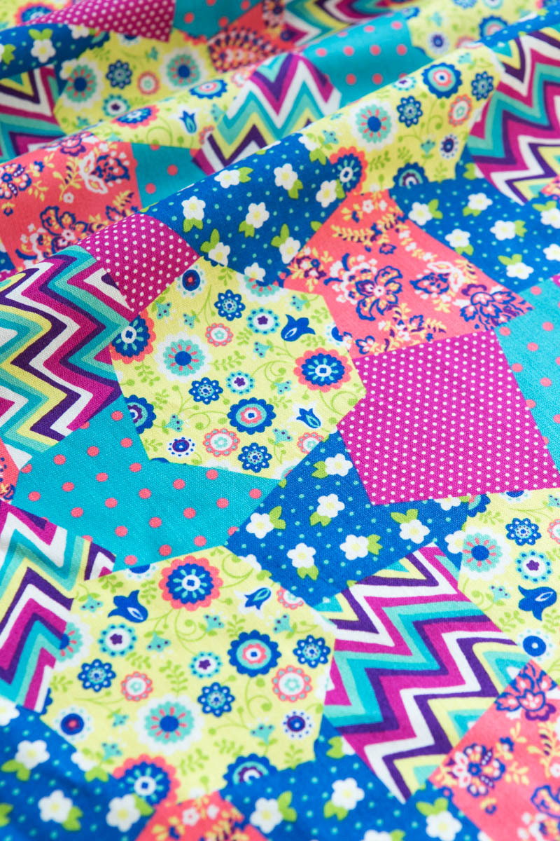 A variety of shapes are randomly patchworked. Cotton cloth is a fabric with a little tension, so it is great for making clothing as well as bags. A stuffed animal’s body would look cute with this patchworked-look fabric.