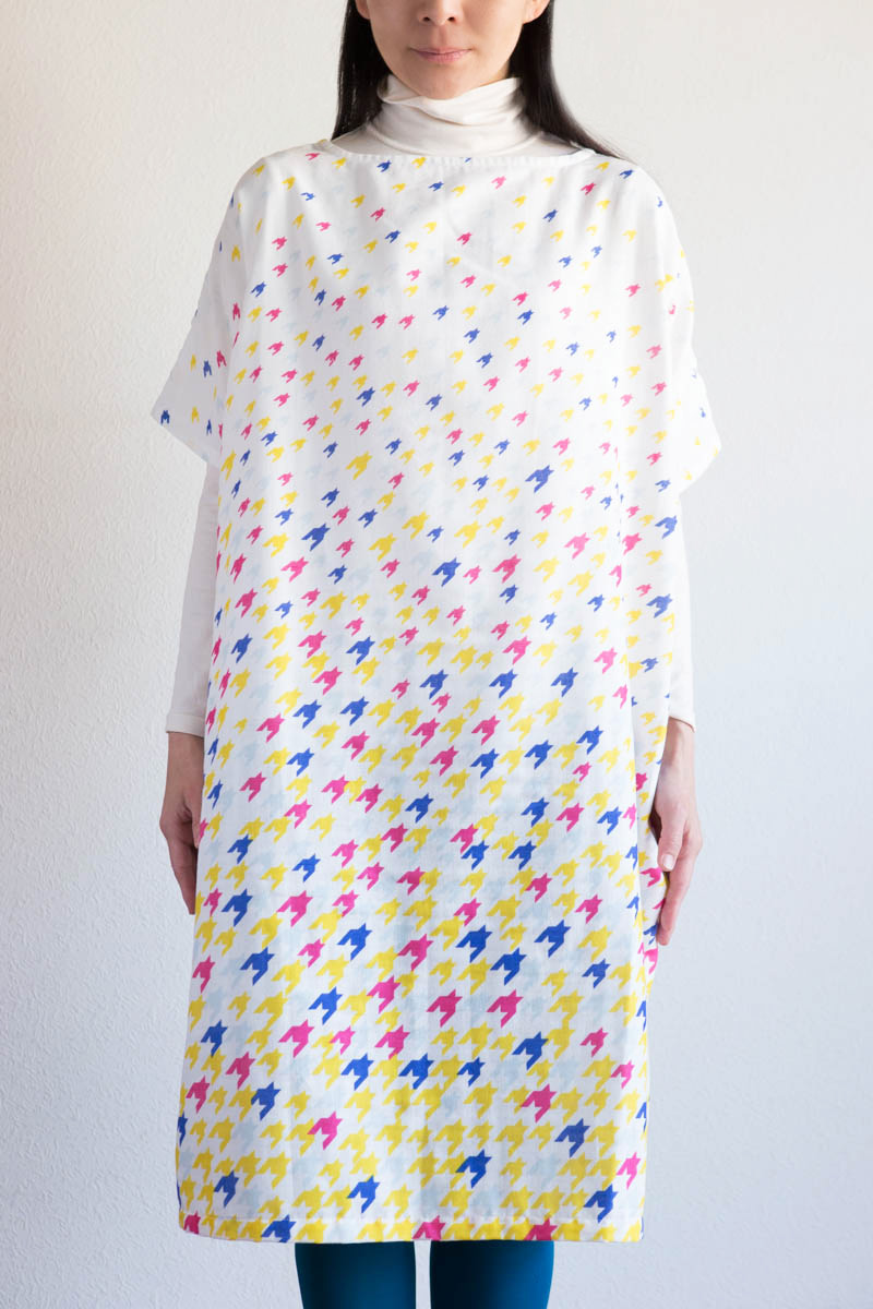 Transformed hounds tooth pattern is randomly placed throughout the fabric. This soft texture double gauze has a refreshing white background combined with calm dark tones. Its fluffy feel is suited for making a dress, pillow case or handkerchief.