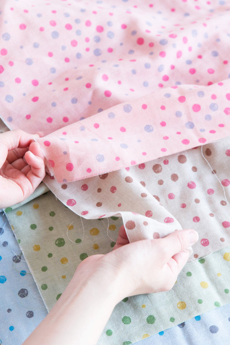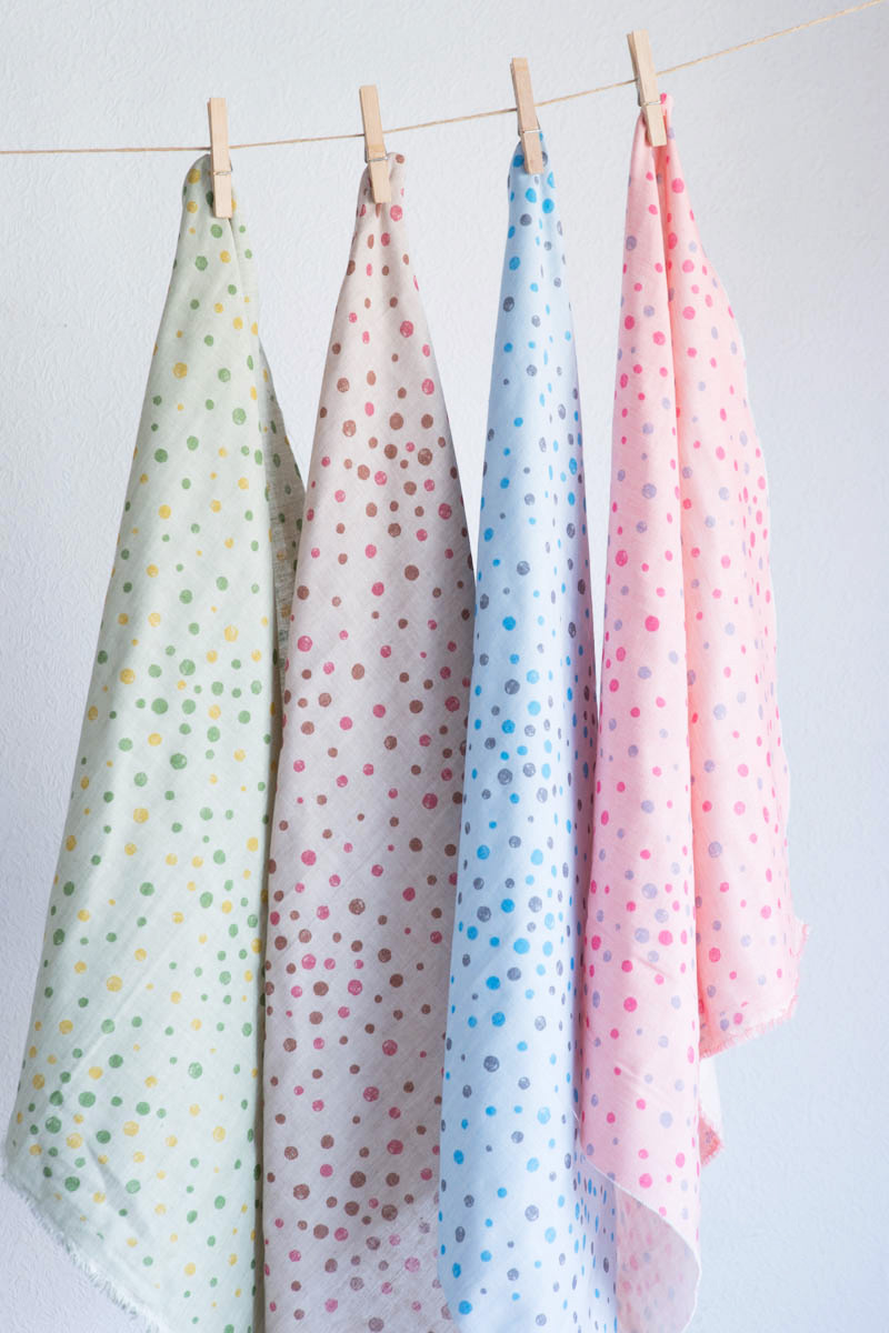 The hand-drawn style random polka dots in various sizes cover this fabric. The gradation of pale color tones creates a beautiful look. Hair accessories like a scrunchy will look cute in this fabric.