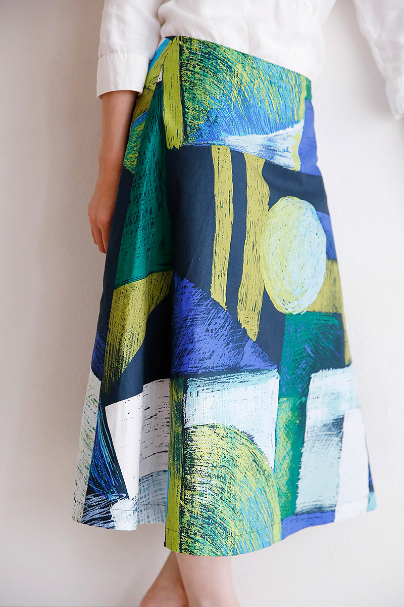 The neon lights looking sharp at night and the lively townscape on the weekend are the design inspirations. By printing the patterns against the dark background, variety of textures stand out and look brilliantly in a hand-drawn manner. The bold pattern is perfect for bags as well as for a primary piece like a skirt or a one-piece dress.