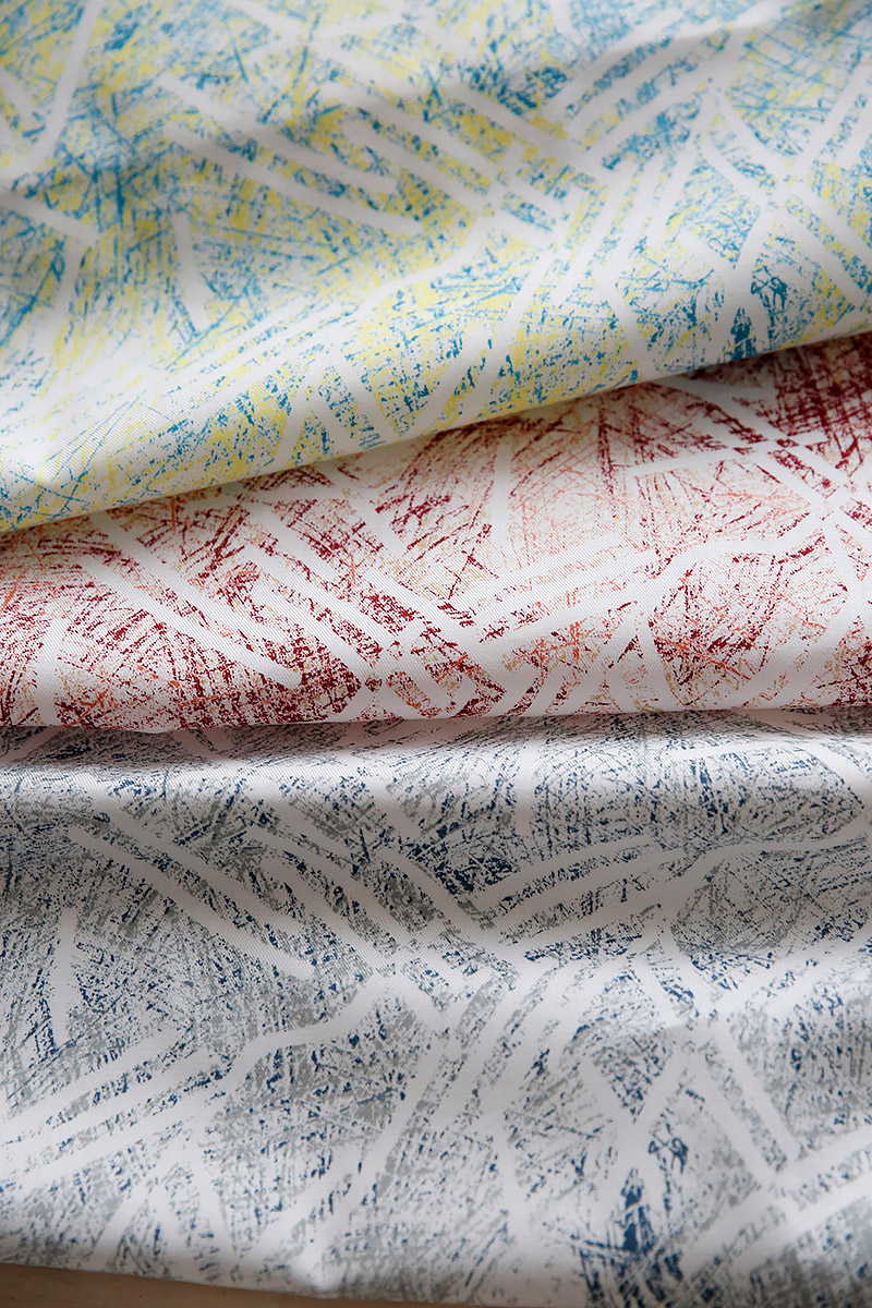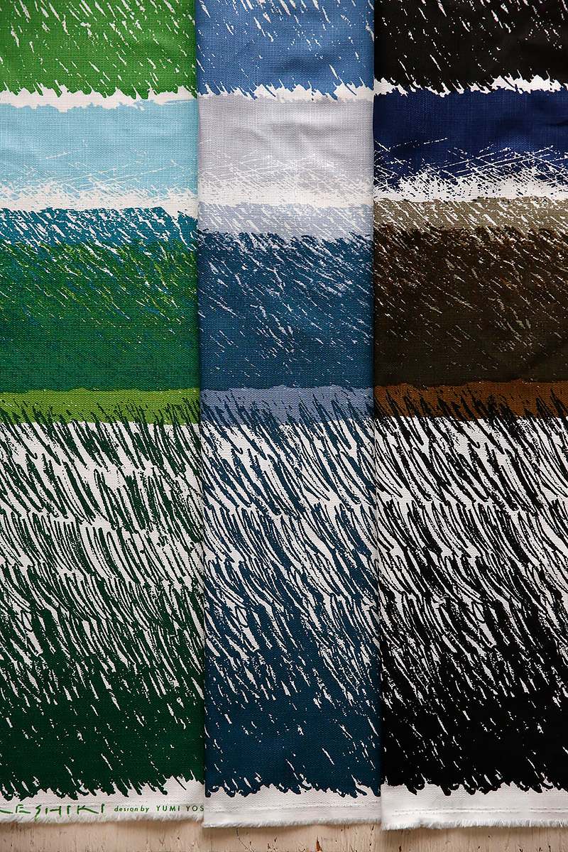 “A fabric that decorates everyday living like a landscape painting” is the concept behind the birth of the KESHIKI series. The usual sceneries like sky, mountain and cityscape are freely and spontaneously composed in line drawings to create the patterns.