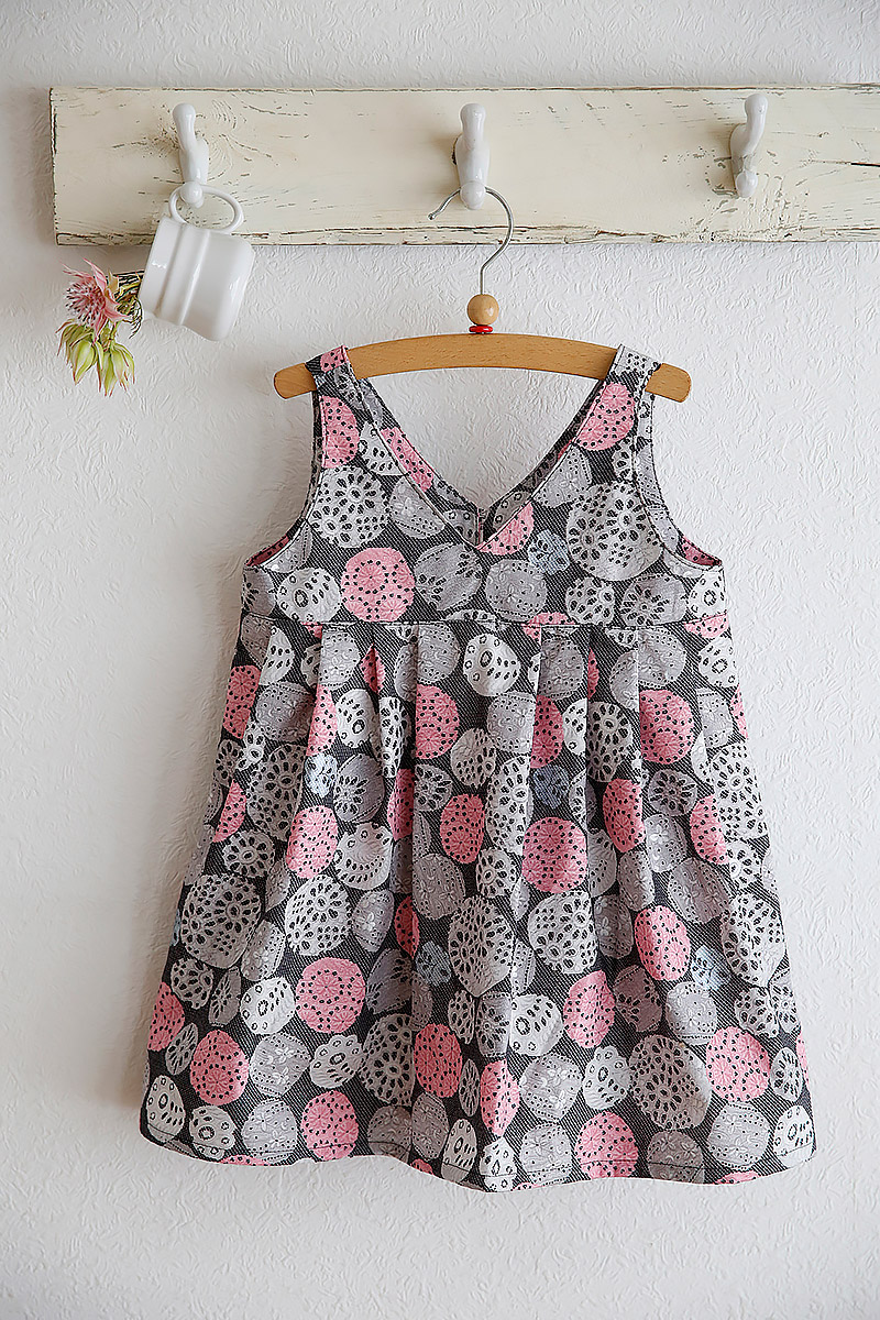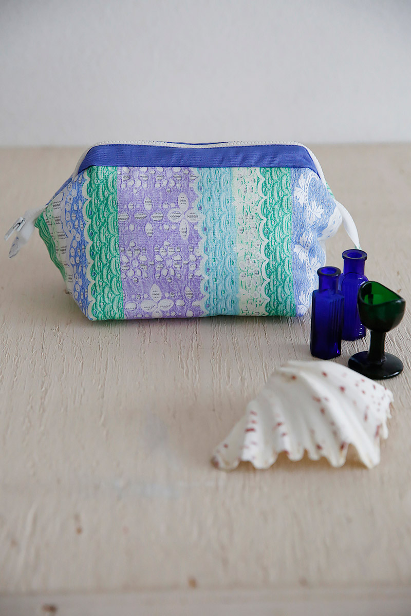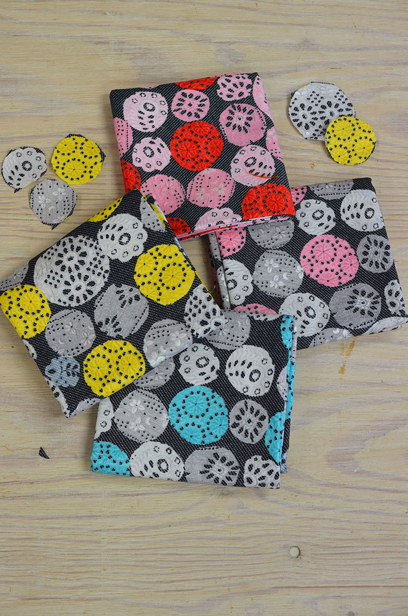 Various laces are cut into circles and placed over a denim-like print to create Lace Dot’s polka dot design. Easy-to-use oxford fabric is versatile for different purposes. It comes in four color patterns, gray base with pink, blue or yellow as an accent color, and a more festive red and pink combination.