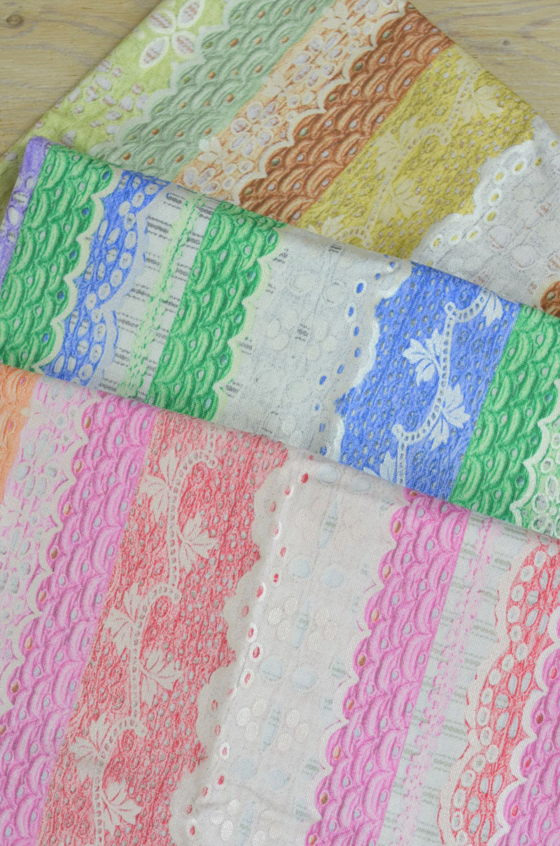 Lovely lace design fabric is here. What inspired this design was the “Premiere Vision Paris” trade show in Paris. At this show, there was a fantastic encounter with a lace design presented by a British designer. The design consisted of pieced laces, looking like a beautiful collage work. Then we thought, “It would be great if we could recreate this design in print fabric!”