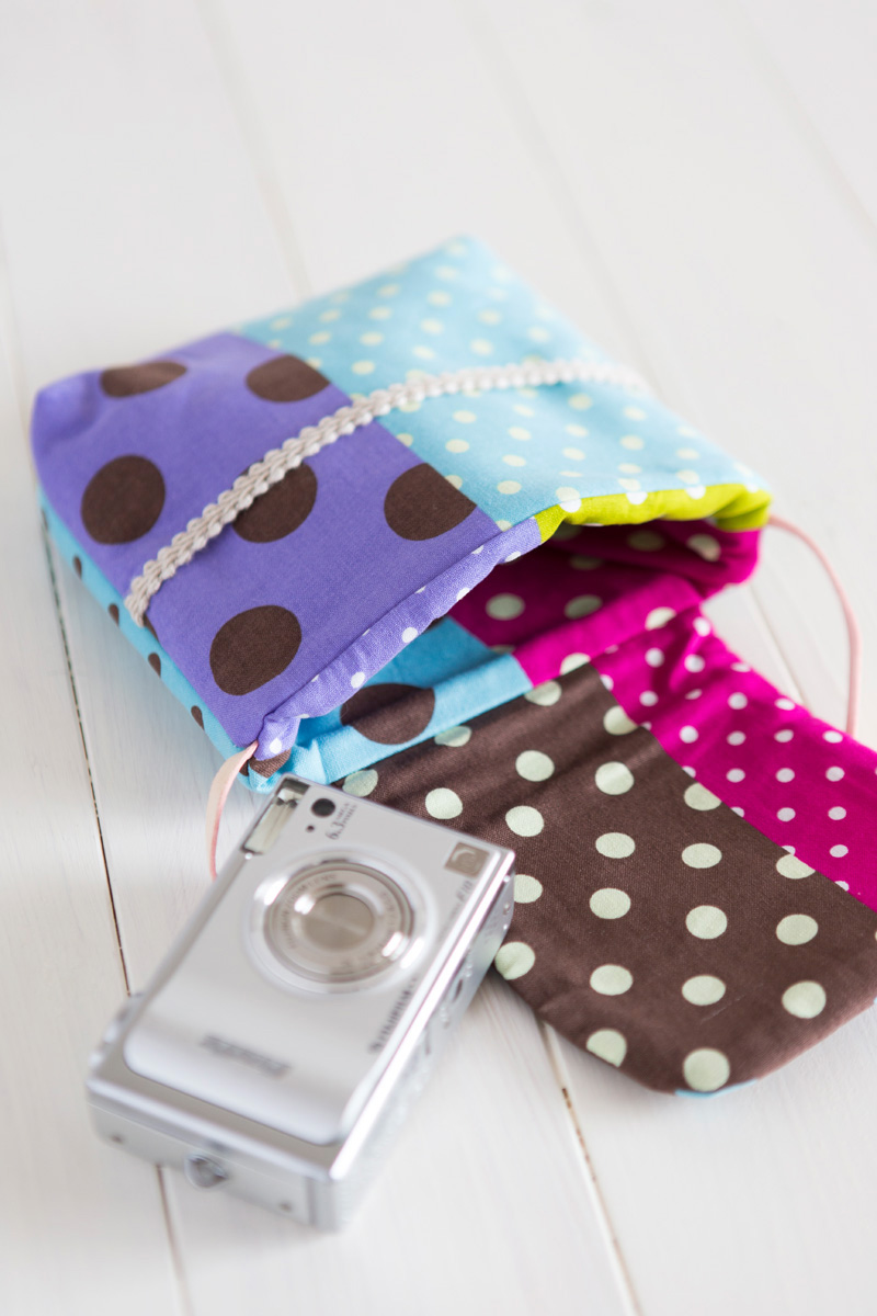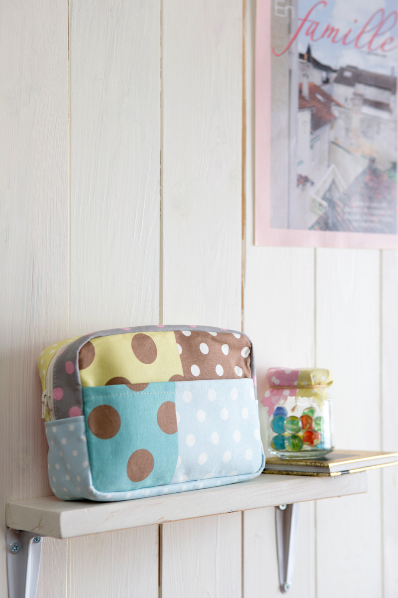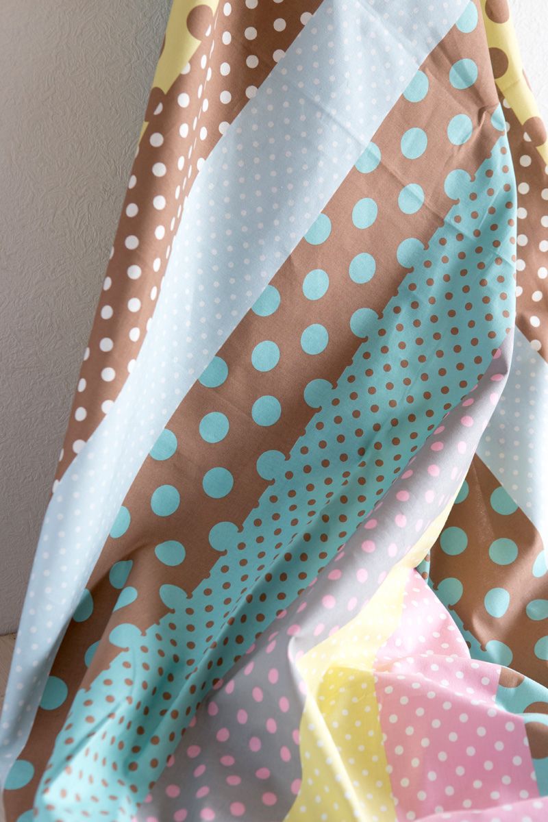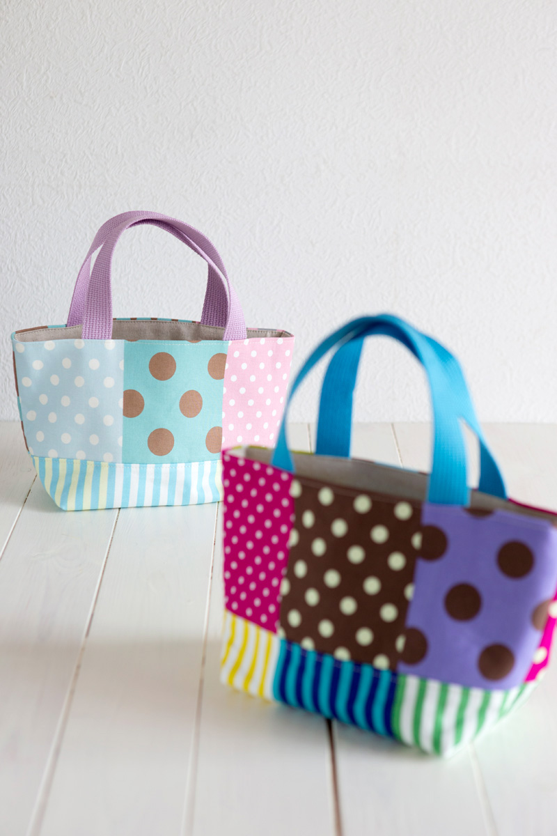 The simple polka dots of variable sizes are lined up in a piece of fabric. The one in the pastel colors is perfect for girlish small items. Another fabric with vivid pink and brown was inspired by kids’ clothes in Paris. A patchwork pouch with your favorite parts of this fabric must be cute, too.