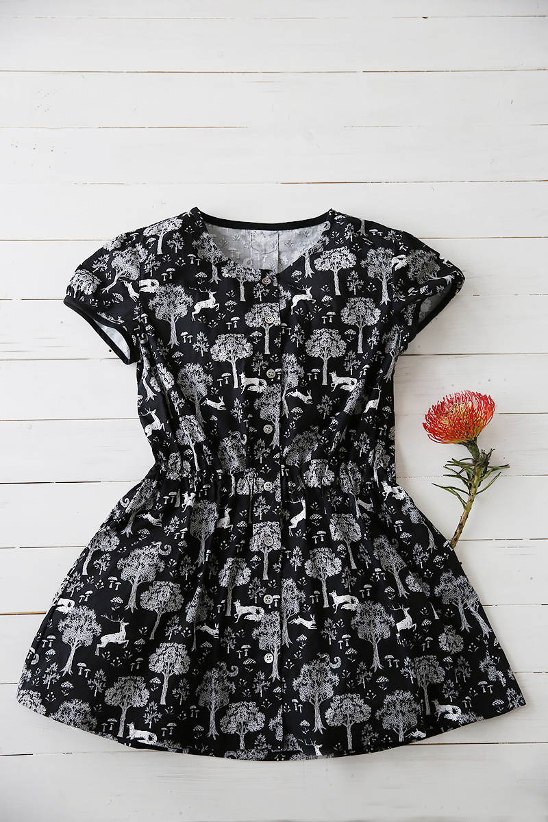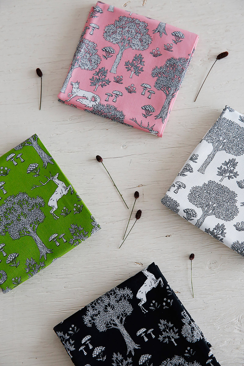 This design epitomizes Monochrome. The scenery and animals of the forest are expressed in an etching style. A dress for an adult will look chic and stylish in this fabric.