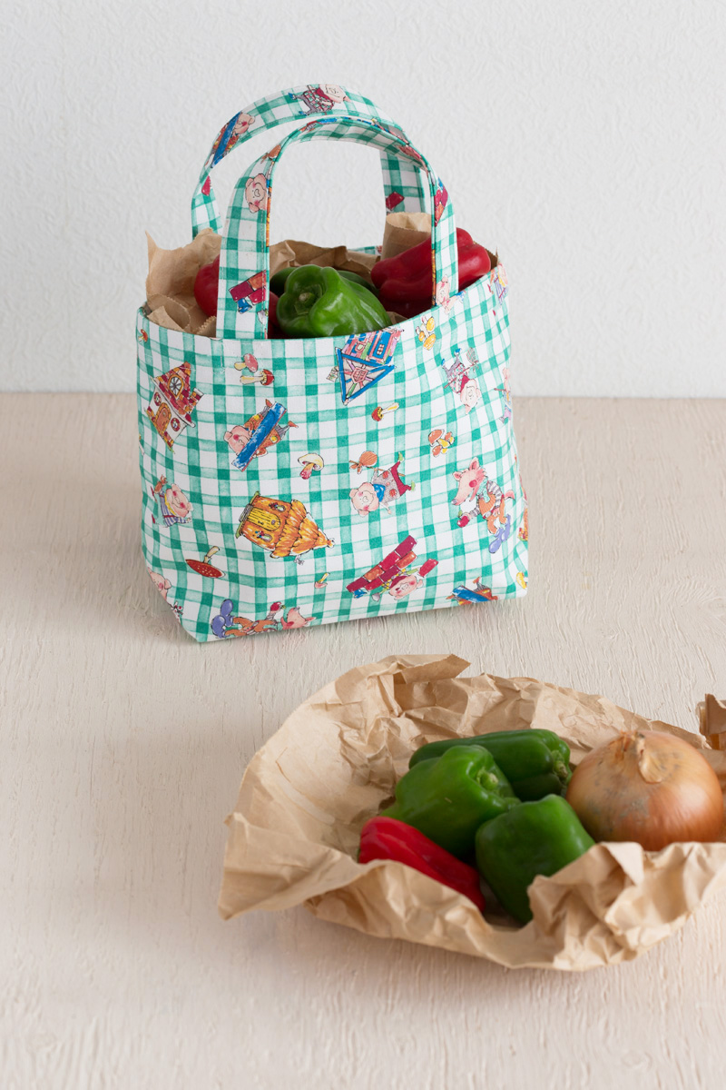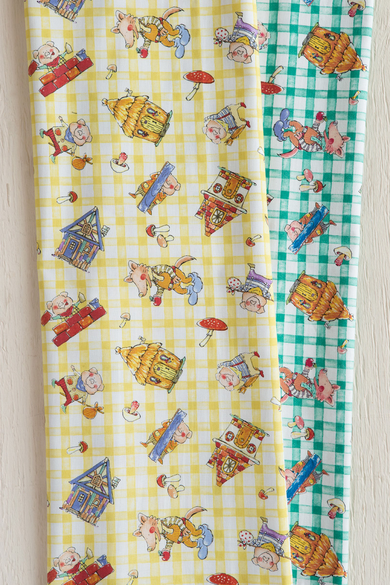 This fabric has a whimsical overall design with three little pigs dancing around atop a hand drawn gingham check background. Shiomi says, “I will teach you how to tell the identical three little pigs apart. The oldest who built the straw house is wearing a border pattern outfit. The one in a pair of striped pants is the second brother who made the house out of wood. The youngest, the builder of the brick house, is wearing a patchwork vest. Please also give loving attention to a kind-hearted wolf who wants to make friends with the three brothers.”