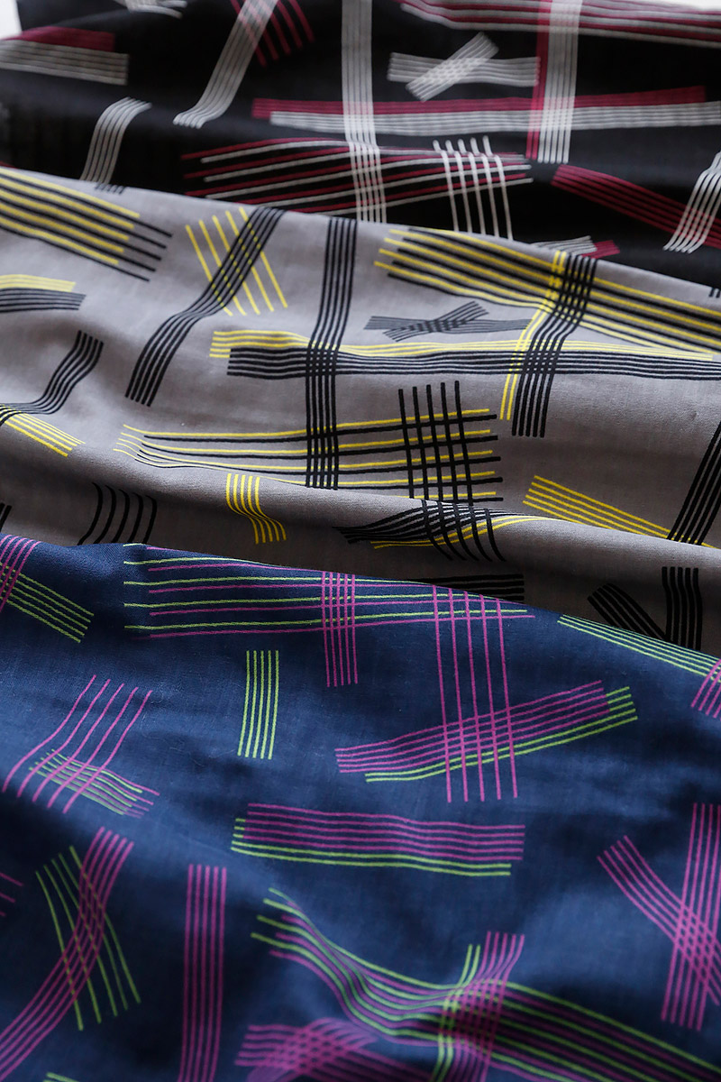 Atlanta, USA resident and quilter Ellen Baker’s new fabrics, Parallels, are here. Inspired from the 1980s style, this new collection features a design in double gauze, cotton linen canvas and flannel, each with two different designs for a total of six. This week we are introducing the double gauze selections.