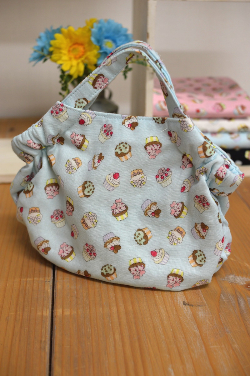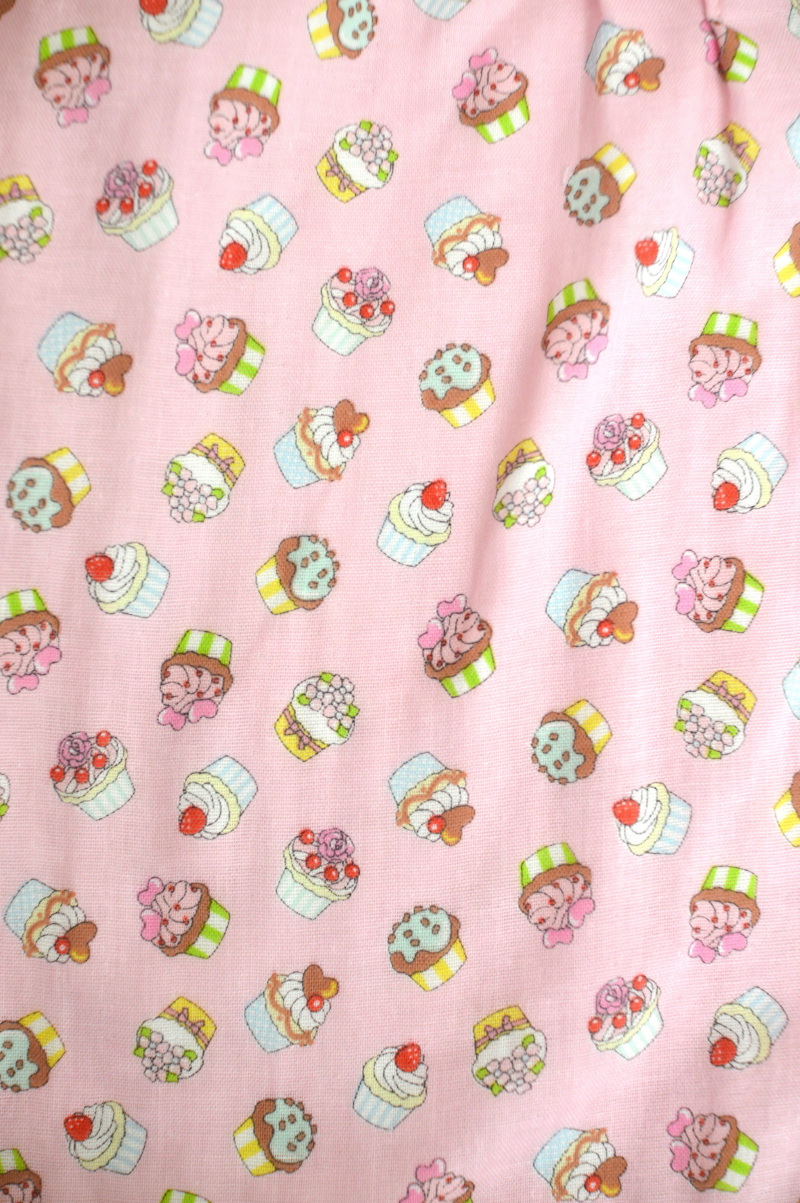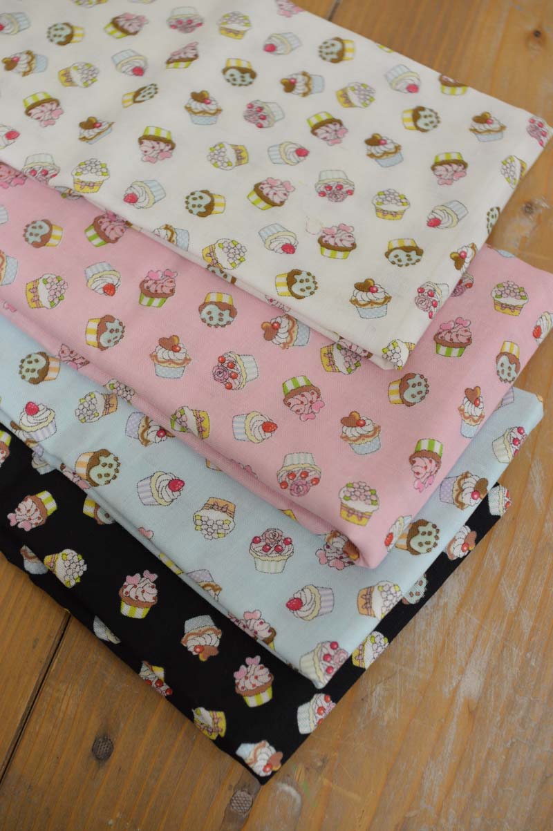 What a cute pastel tone fabric with sweet motifs! Like the front window of a cupcake store, different flavors of cupcakes are all over the fabric. Embellish it with laces and ribbons for girls who love fairy tales.