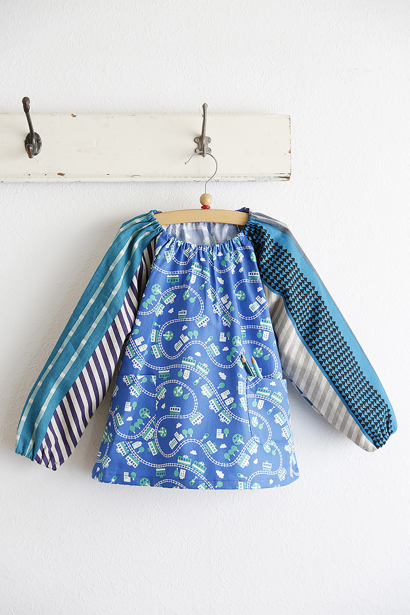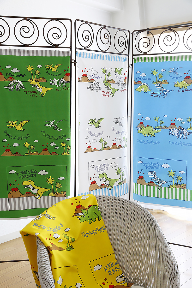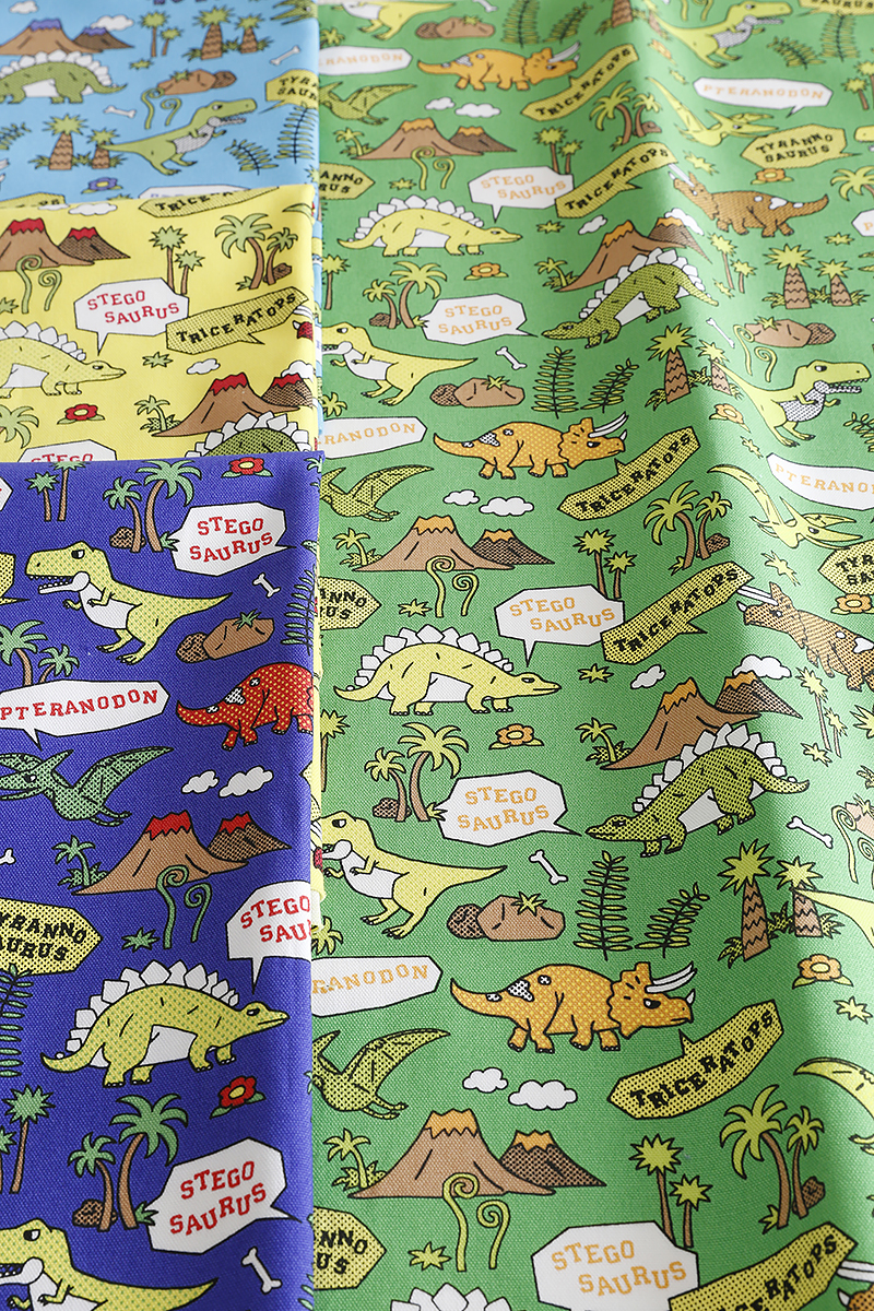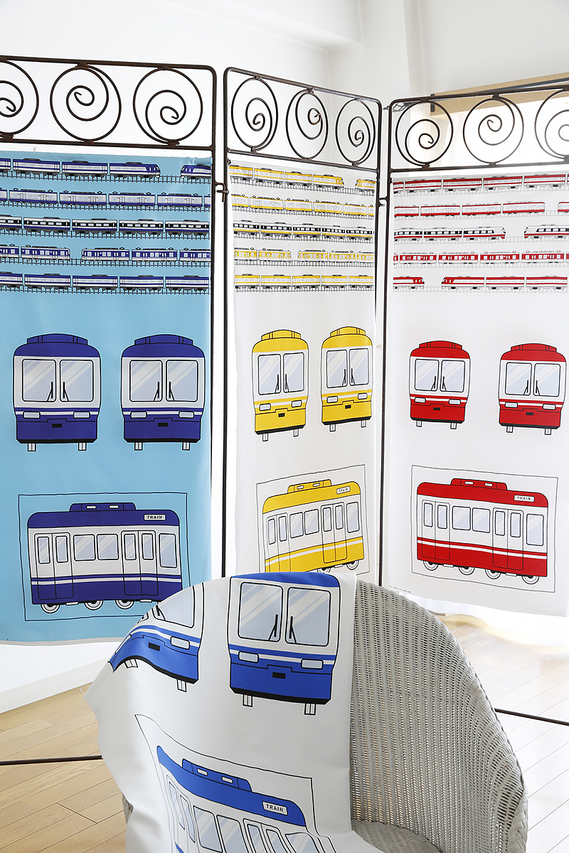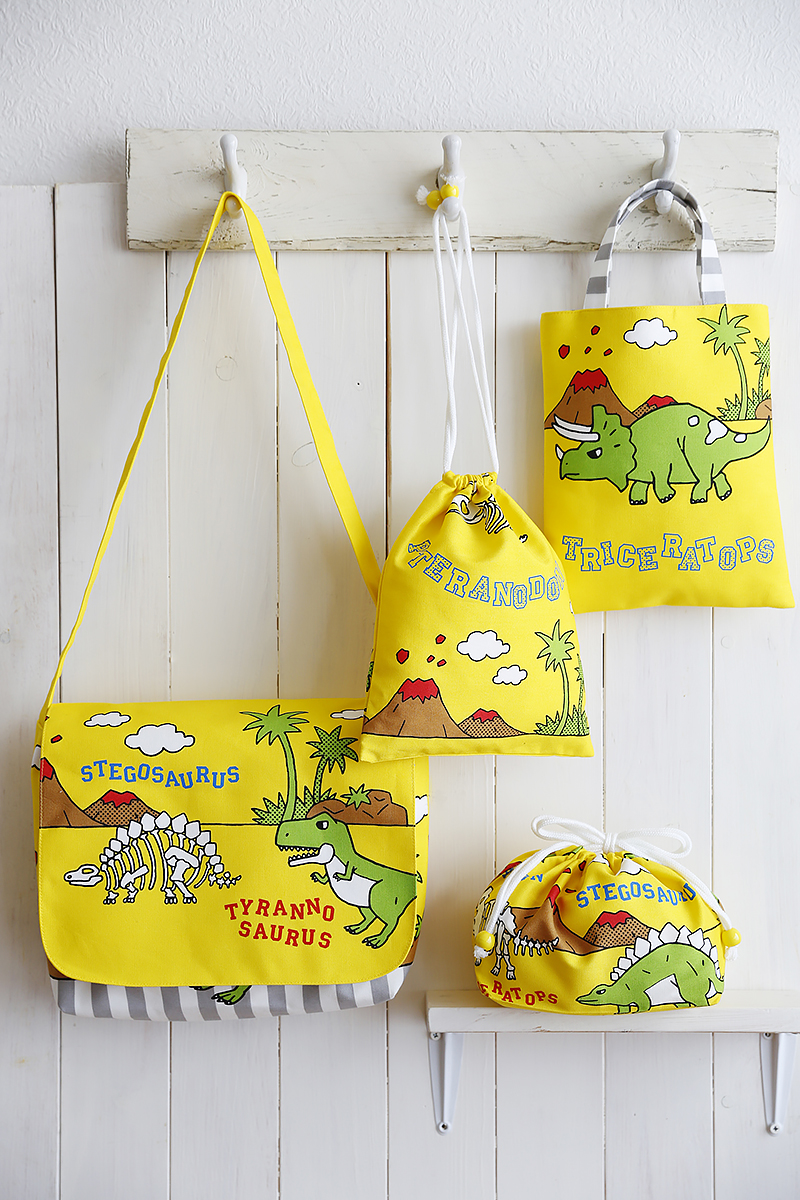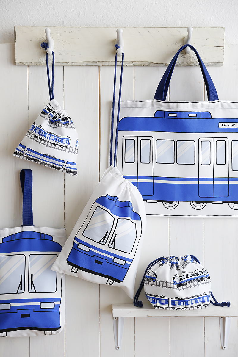 Trains are popular motifs for boys’ new school year items. The items made with this fabric, a lesson bag uniquely using the fabric panel and a shoes case with a wide front view of the train, are fun to carry around.