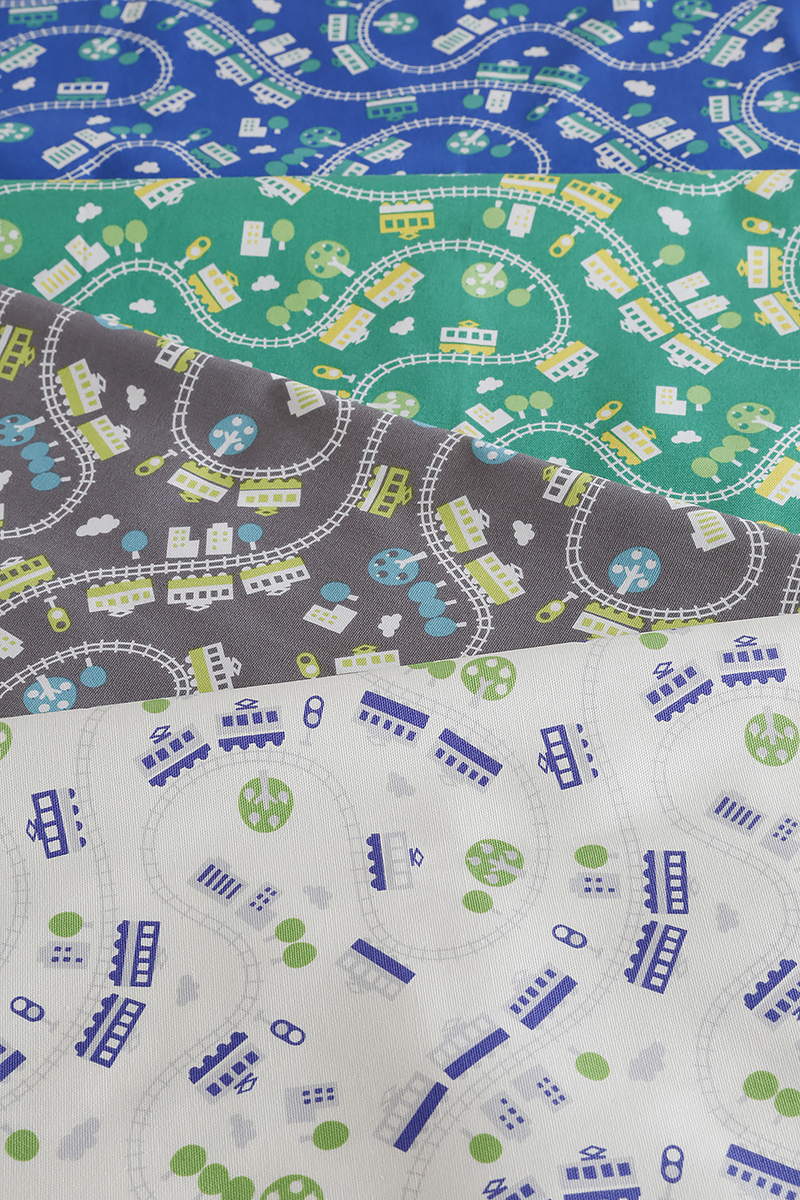 With color tones in a slightly Scandinavian style, this fabric features running trains all around on a track. As the color scheme is simple, combining this fabric with a fabric panel will look lovely.