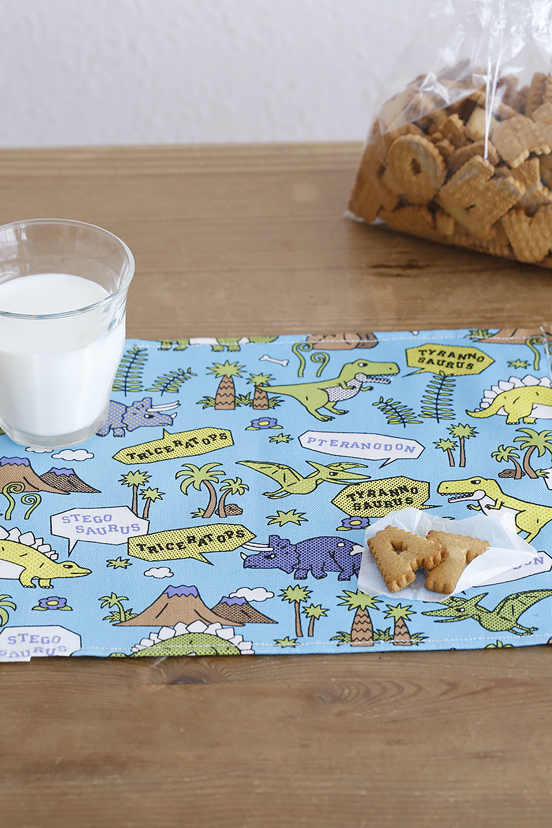 The dinosaur fabric panel has a repeating design of dinosaurs and bones. On the front you see the dinosaurs and the bones appear on the back…such fun can be added to the items made for a new school year.