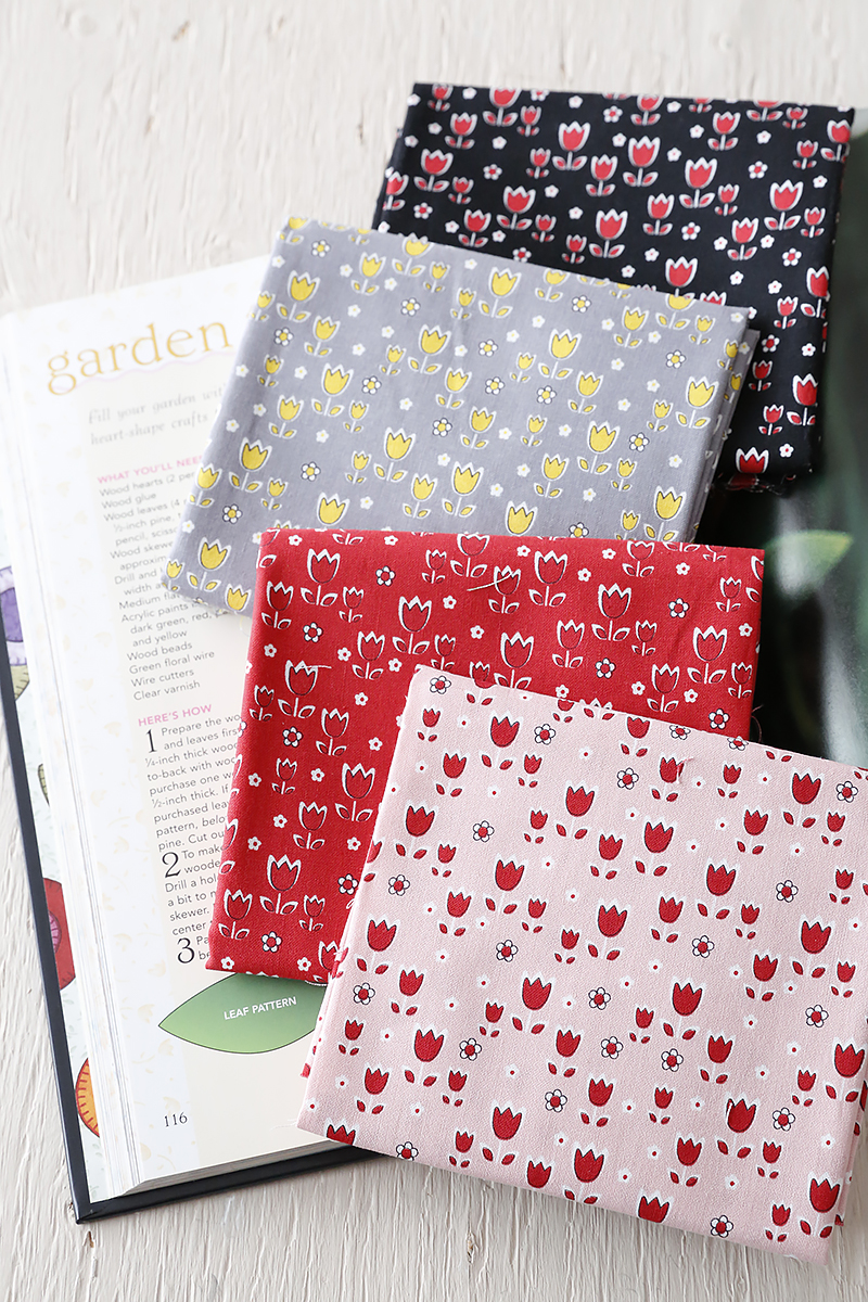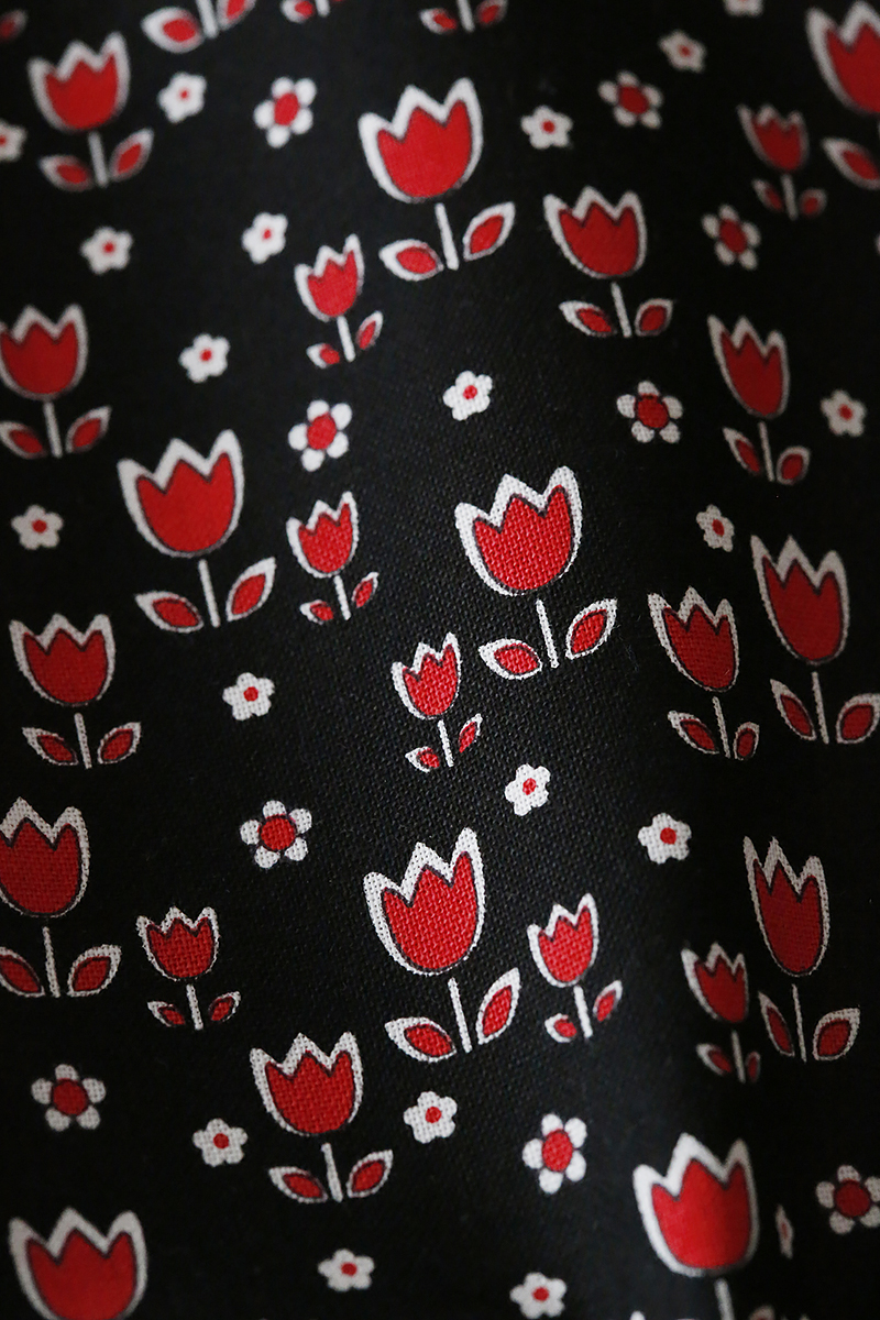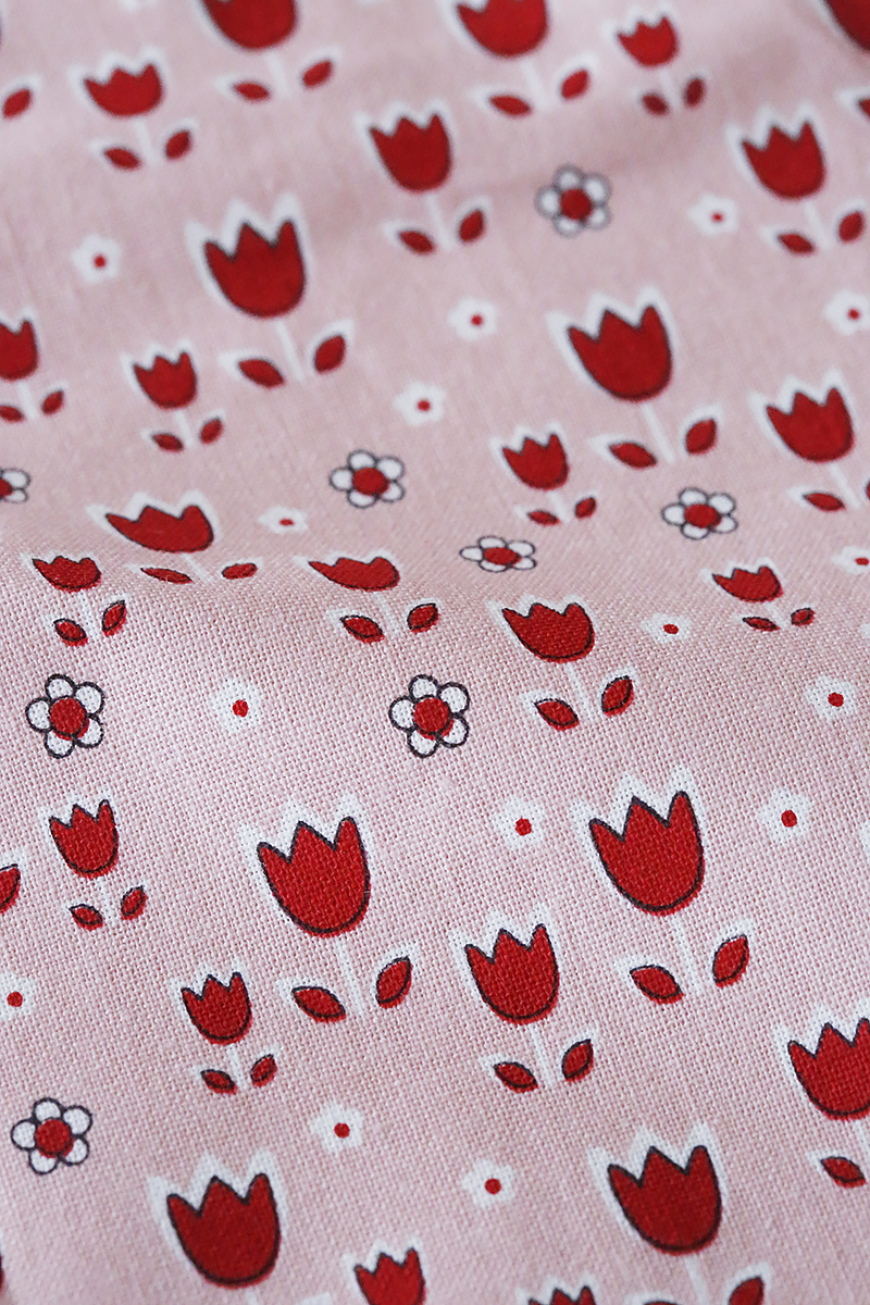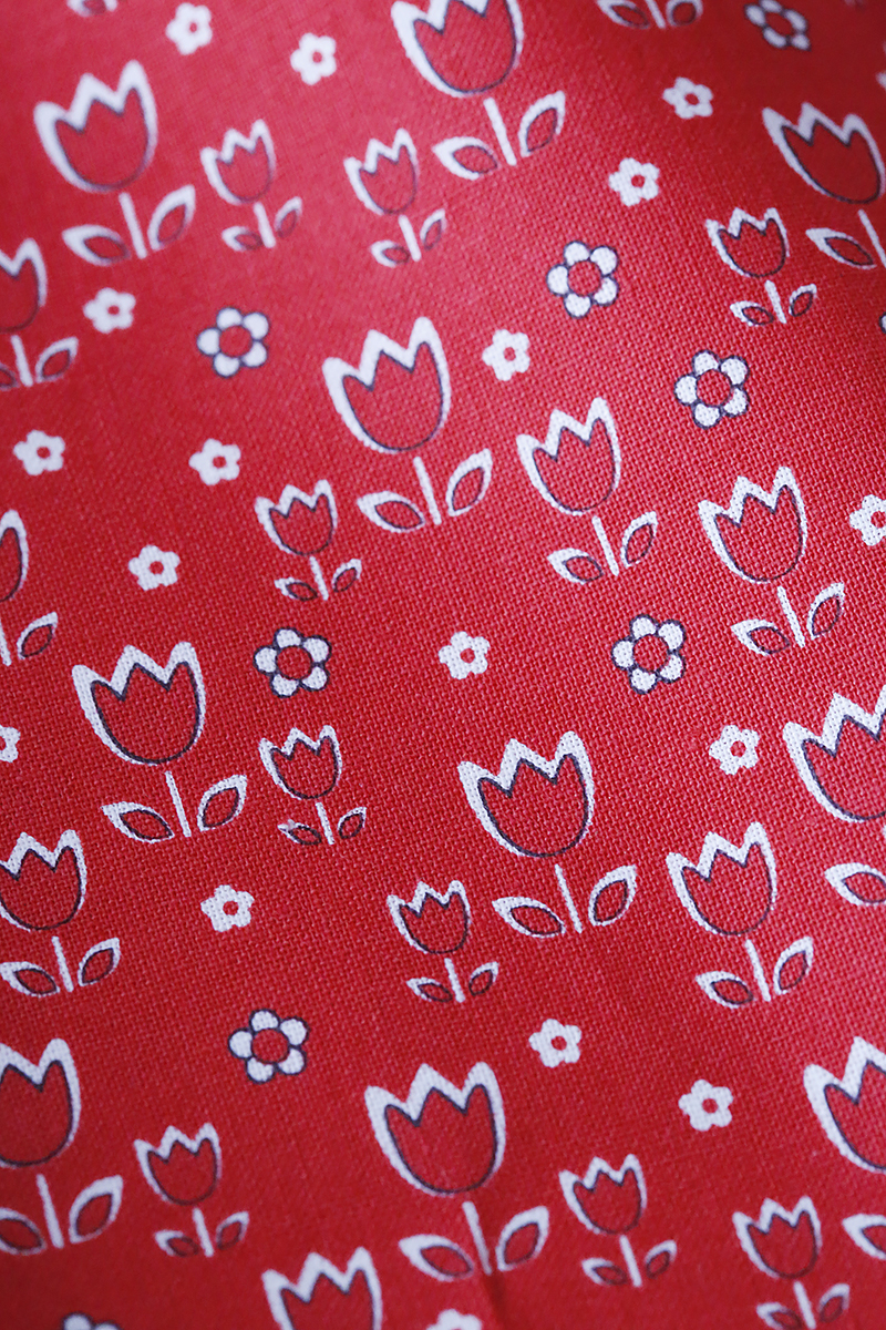 Petite size tulips line up like a paper cutout. A small case made with this fabric could have a solid shape with fusible interfacing on the back. Subtle and simple color tones are perfectly suited for small items as well as for a lovely kid’s dress.