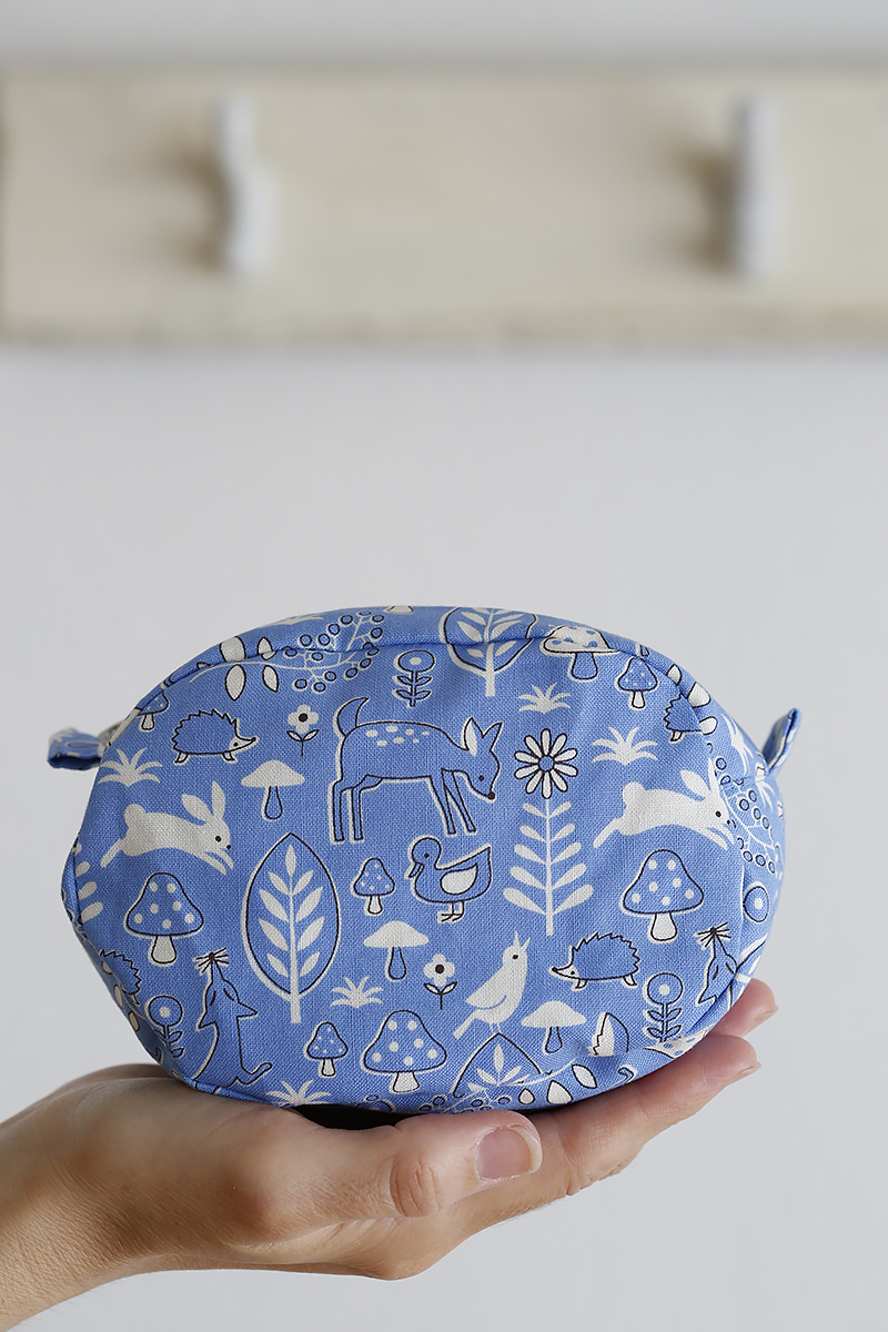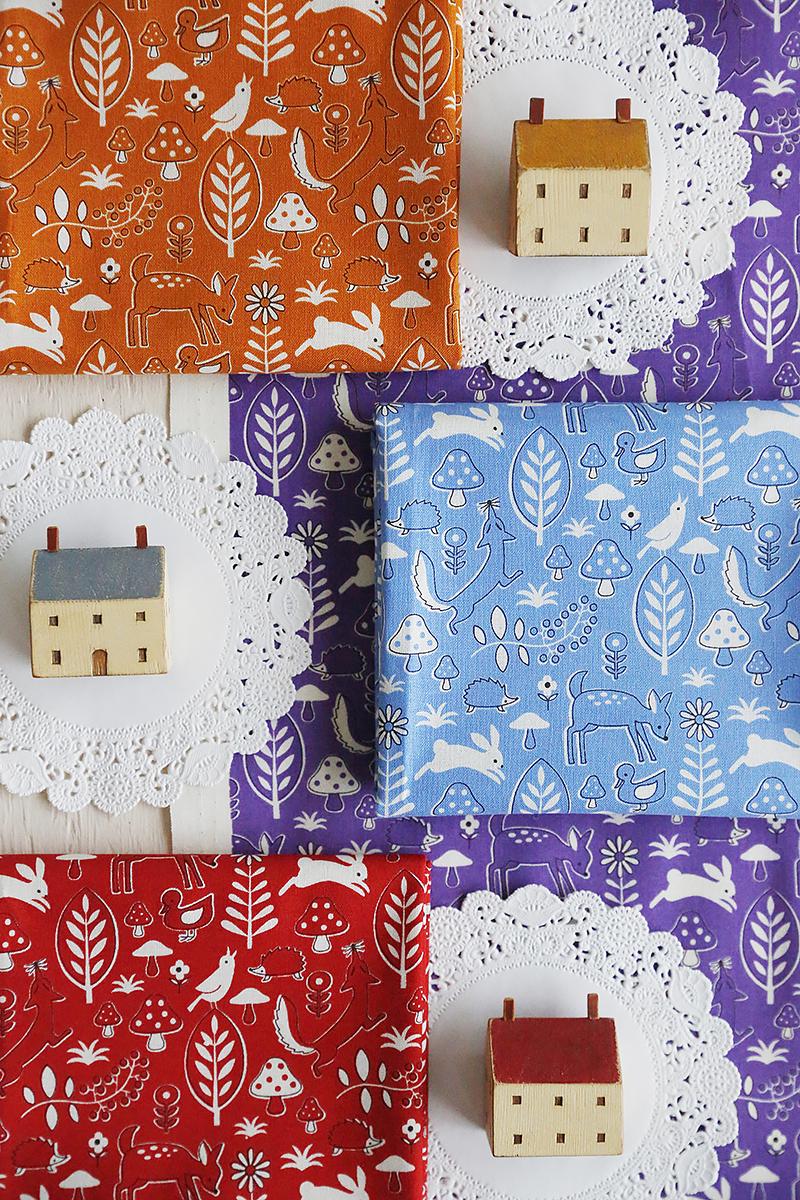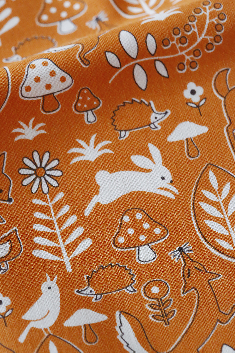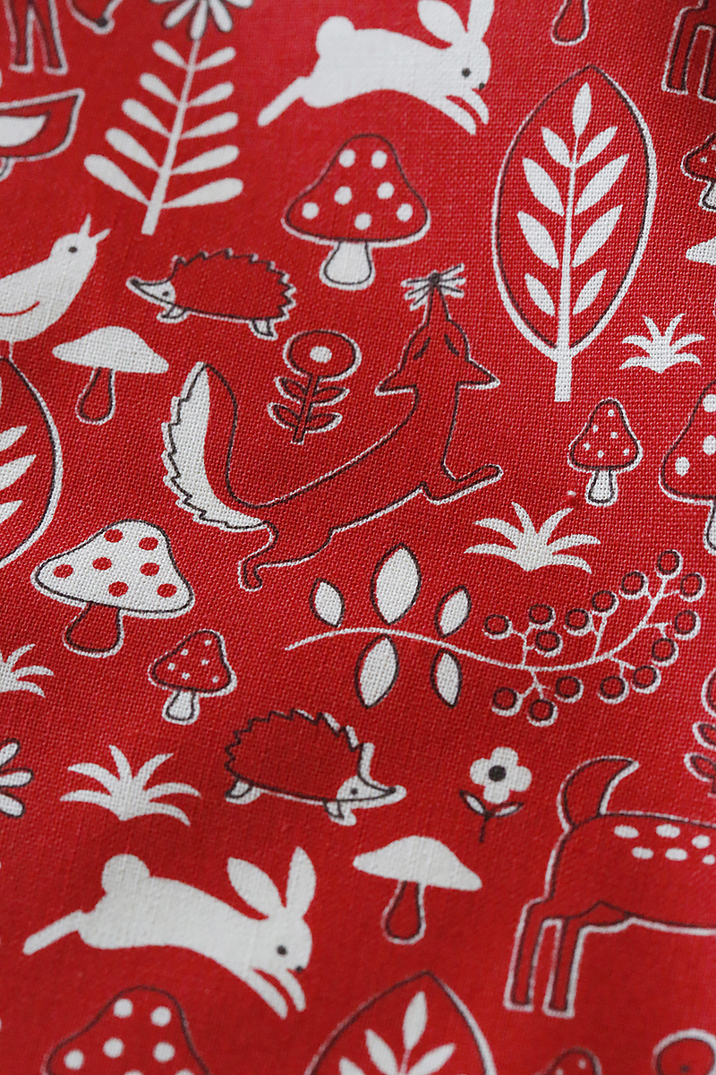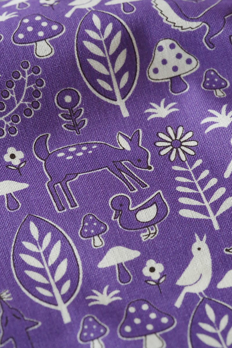 The designs of animals and plants living in the woods cover the entire fabric. White outlined motifs in a monochromatic colored background are the design accent. Combining it with a linen fabric will create a stylish Scandinavian look. A placemat with an accent border in this fabric will be pretty.