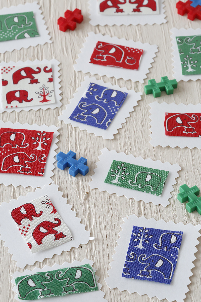 A popular elephant motif in a tiny design is here! Isn’t this design fun with smiley elephants looking at each other on a tree trunk? A cutout of this fabric makes a tag with a nice accent.