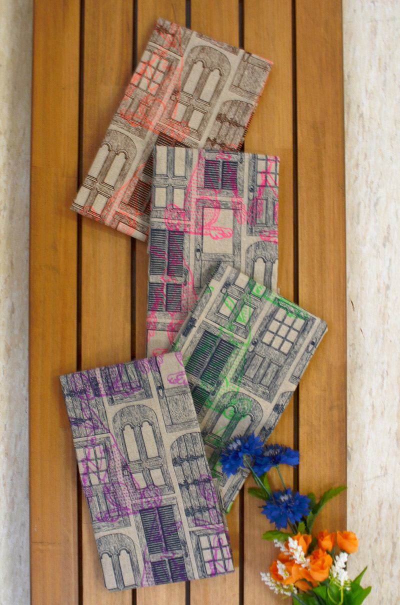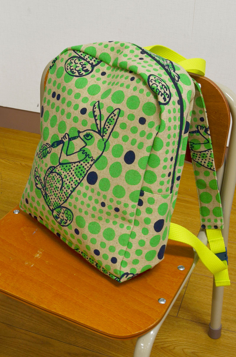 A Bold design print with fluorescent pigment is here. Neon color is intentionally placed on top of the unbleached cotton/linen canvas to create an unusual color finish. Overlapping motifs result in a unique design. Why not making a roomy, large size bag utilizing the texture of cotton/linen canvas? The more you use it, the texture of the fabric and its print become more attractive.
