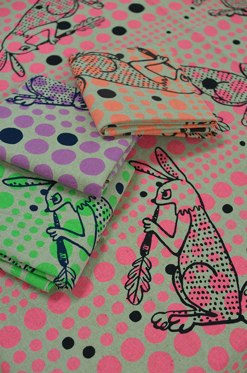 Polka Dot is a pop looking print with rabbits on top of random dots in fluorescent pigment. A bag made from this material will have such impact that it will definitely attract attention. It comes in pink, green, purple and orange, typical and standard colors of neon.